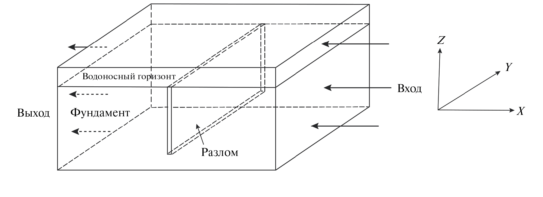 Верхний слой модели с вертикальной мощностью 1 км представляет объединенный водоносный горизонт над и под поверхностью несогласия, нижний слой с вертикальной мощностью 5 км представляет породы фундамента бассейна Комболджи. Верхняя и нижняя границы модели непроницаемые. Поток флюидов поступает в область моделирования по сечению правого торца модели (Вход) и разгружается по ее левому торцу (Выход). На этих торцах области моделирования для имитации условий напорного режима потока флюидов предусмотрена возможность задания значений пьезометрического давления pвход и pвыход, разность которых, отнесенная к длине Xlim пути миграции флюидов по трассе “вход → выход” вдоль оси Х, определяла значение линейного градиента гидравлического напора grad p = (pвход – pвыход)/Xlim в области моделирования. На торцевых сечениях верхнего слоя области предусмотрена также возможность задания различных значений проницаемости пород и с градиентом линейного изменения флюидопроводимости grad по пути движения флюидов в объединенном водоносном горизонте. При равенстве этих торцевых значений проницаемости верхнего горизонта модели они определяли постоянное значение проницаемости ks пород объединенного водоносного горизонта, т. е. соблюдалось равенство . В середине области задана вертикальная зона разлома в интервале от подошвы верхнего слоя до некоторой глубины в породах фундамента, структура течения флюидов в которой рассчитывалась для ортогонального с осью Х (при Х = 5 км) профильного сечения модели YZ. Эта зона разлома, частично перекрывающая трассу “вход → выход” в породах фундамента бассейна, приводит к реорганизации структуры течения флюидов по оси Х, которая рассчитывалась для ортогональных к оси Y вертикальных сечений области (“сечения XZ”). По результатам расчетов, наряду с определением векторов скорости течения флюидов в профильных сечениях, перпендикулярных осям Х и Y (соответственно “сечения YZ и XZ”), рассчитывалось также распределение температуры в сечении XZ и в горизонтальной плоскости YX в подошве Z = 5 км объединенного водоносного горизонта.