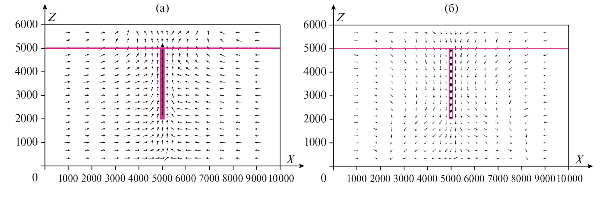 На фиг. 5а приведен пример расчета циркуляции флюидов в сечении модели XZ c восходящим движением флюидов в интервале 3500—5500 м (см. фиг. 4а) вдоль трассы Y = 4500 м, на фиг. 5б – с нисходящим движением флюидов в интервале 6000—8000 м (см. фиг. 4а) вдоль трассы Y = 7000 м. Сфокусированное по зоне разлома нисходящее движение флюидов на фиг. 5б наглядно иллюстрирует, что периодическая структура свободной тепловой конвекции допускает возможность нисходящего движения флюидов по зоне рудоконтролирующего разлома, которое, однако, не согласуется, как предполагалось в (Мальковский и др., 2019), с “представлением об инфильтрационном формировании месторождений несогласия района Аллигейтор-Риверс” (с. 216). Определяющим условием рассогласования с возможностью такой генетической интерпретации является гидродинамическая сопряженность ветвей нисходящей и восходящей конвекции, отчетливо зафиксированная в нижней части структуры периодической конвекции на фиг. 4а процессом перетекания флюидов из нисходящей ветви конвекции в восходящую. Если исходить из предположения, что флюиды нисходящей ветви конвекции отлагали в зоне разлома рудную минерализацию, то по сопряженной восходящей ветви конвекции должны были разгружаться “отработанные” флюиды, которые могли отлагать парагенную, но безрудную минерализацию. В приложении к обстановкам формирования месторождений такое предположение означает, что по простиранию зоны рудоконтролирующего разлома должны были локализоваться (и при том одновременно) структурно сопряженные области с относительно низкотемпературной инфильтрационной рудной минерализацией и тесно ассоциирующей с ней более высокотемпературной эксфильтрационной безрудной минерализацией.