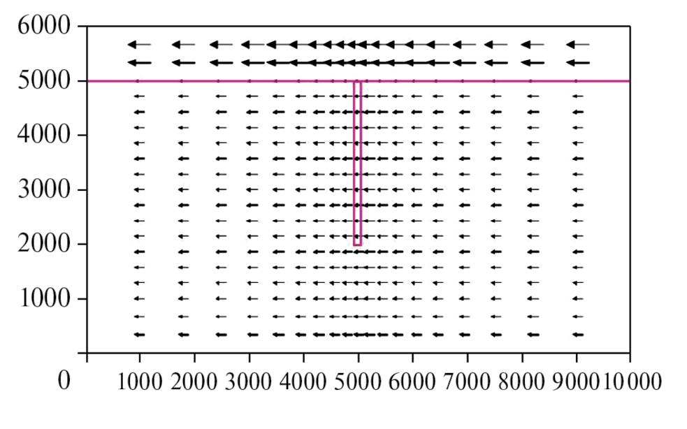 Вынужденноконвективное движение флюидов и режим смешанной конвекции. Для мобилизации урана из его рассредоточенных источников в урансодержащих породах фундамента бассейна Комболджи при постановке задачи моделирования был предположен процесс напорной миграции флюидов над и под поверхностью несогласия по объединенному водоносному горизонту в подошве формации Мамадаверре. Поскольку по результатам палеотопографической реконструкции (Hiatt et al., 2021) гидравлический напор создавал разность высотных отметок между областями питания водоносного горизонта и районами локализации месторождений, миграция флюидов происходила в вынужденноконвективном напорном режиме как в объединенном водоносном горизонте, так и в породах фундамента бассейна Комболджи. Для моделирования такого общего для всей области моделирования режима вынужденной напорной конвекции на боковых торцах модели задавались значения пьезометрического давления флюидов pвход > pвыход, разность которых, отнесенная к длине Xlim = 10 км пути миграции флюидов по трассе “вход → выход” вдоль оси Х, определяла значение линейного градиента гидравлического напора grad p = (pвход – pвыход)/Xlim. По результатам проведенных расчетов до достижения порогового значения проницаемости для развития тепловой конвекции в зоне разлома, равного kf = 8×10–15 м2, режим напорной конвекции обусловливает невозмущенное горизонтально ориентированное перетекание флюидов между торцами области. Пример такого вынужденноконвективного напорного перетекания флюидов при субкритическом значении проницаемости зоны разлома kf = 1×10–15 м2 приведен на фиг. 6 для значения гидравлического напора grad p = 2 МПа/10 км, который соответствует разности значений водяного столба высотных отметок топографического рельефа на торцах модели 2MPа = 200 м.