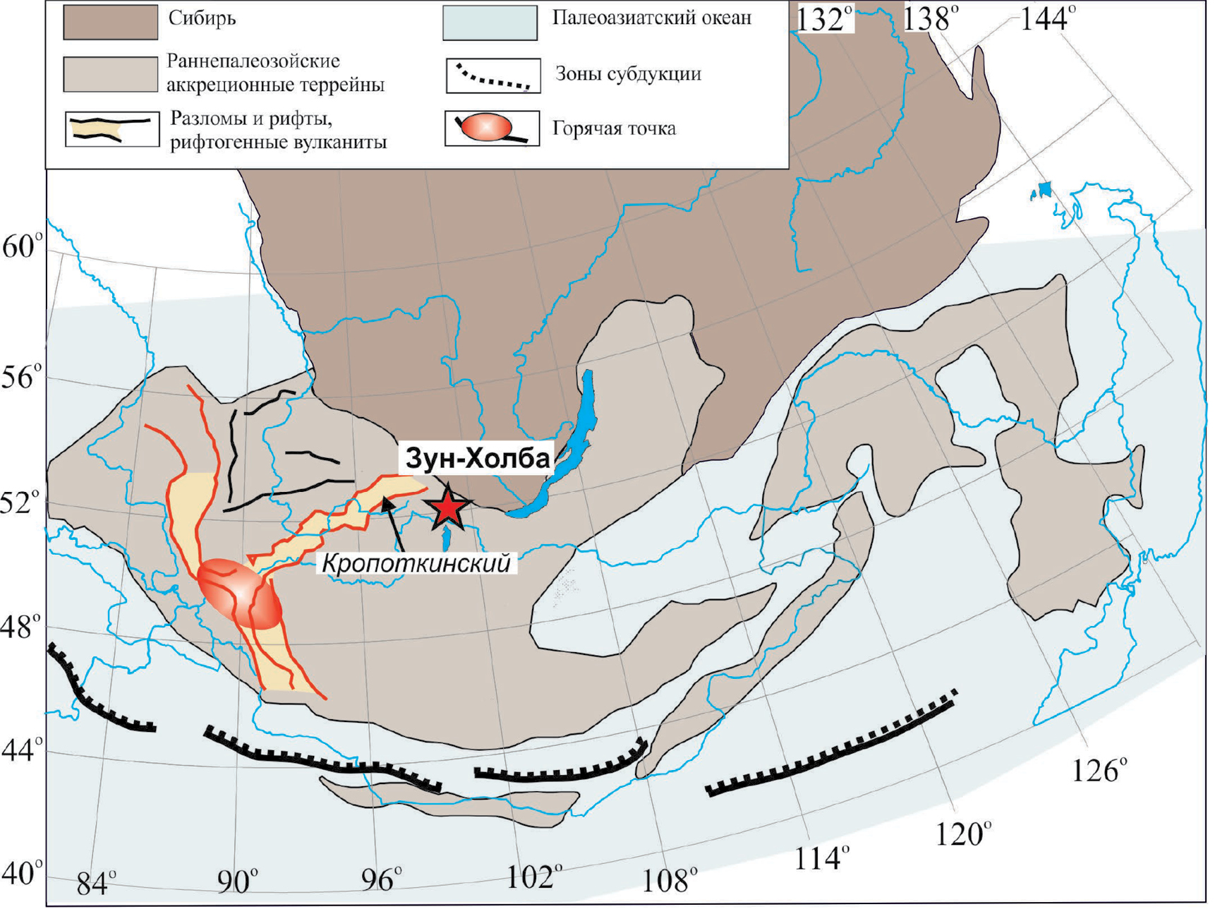 Следующим важным этапом в геологической истории Алтае-Саянской окраины Сибирского континента стали процессы преобразования ее коры в среднем палеозое. В раннем девоне (407—392 млн лет) в ее пределах возникла крупная рифтовая система, связанная с активностью мантийного плюма (Ярмолюк и др., 2013; Vorontsov et al., 2021). Ей отвечает тройная система грабенов, образование которой сопровождалось внутриплитным магматизмом, охватившим всю внутриконтинентальную часть АСО (фиг. 1). Одна из ветвей рифтовой системы — Тувинский прогиб — протянулась вглубь континента. На ее окончании (район хребта Кропоткина) возник крупный ареал щелочно-гранитоидного магматизма.