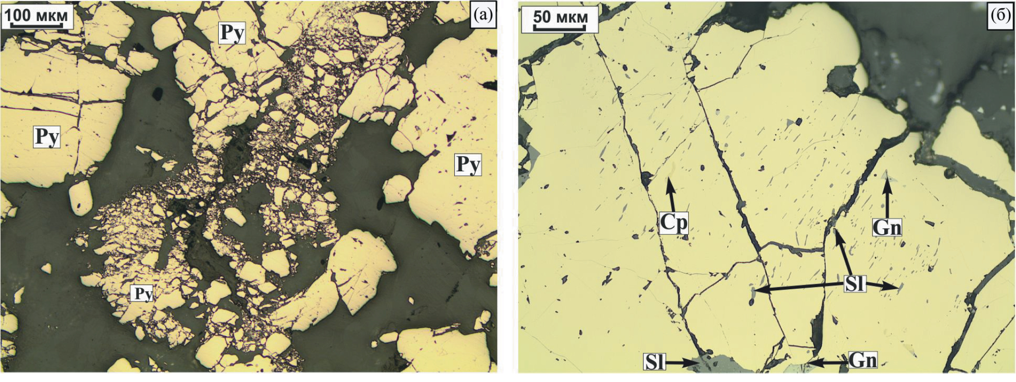 Фиг. 3. Ранний крупно-кристаллический пирит (Py). а – разбит трещинами и раздроблен вдоль них с образованием угловатых разноразмерных обломков, Обр. Пр 17/1, горизонт 1318; б – микровключения сфалерита (Sl), галенита (Gn) и халькопирита (Cp), Обр. 22. Горизонт 1490.