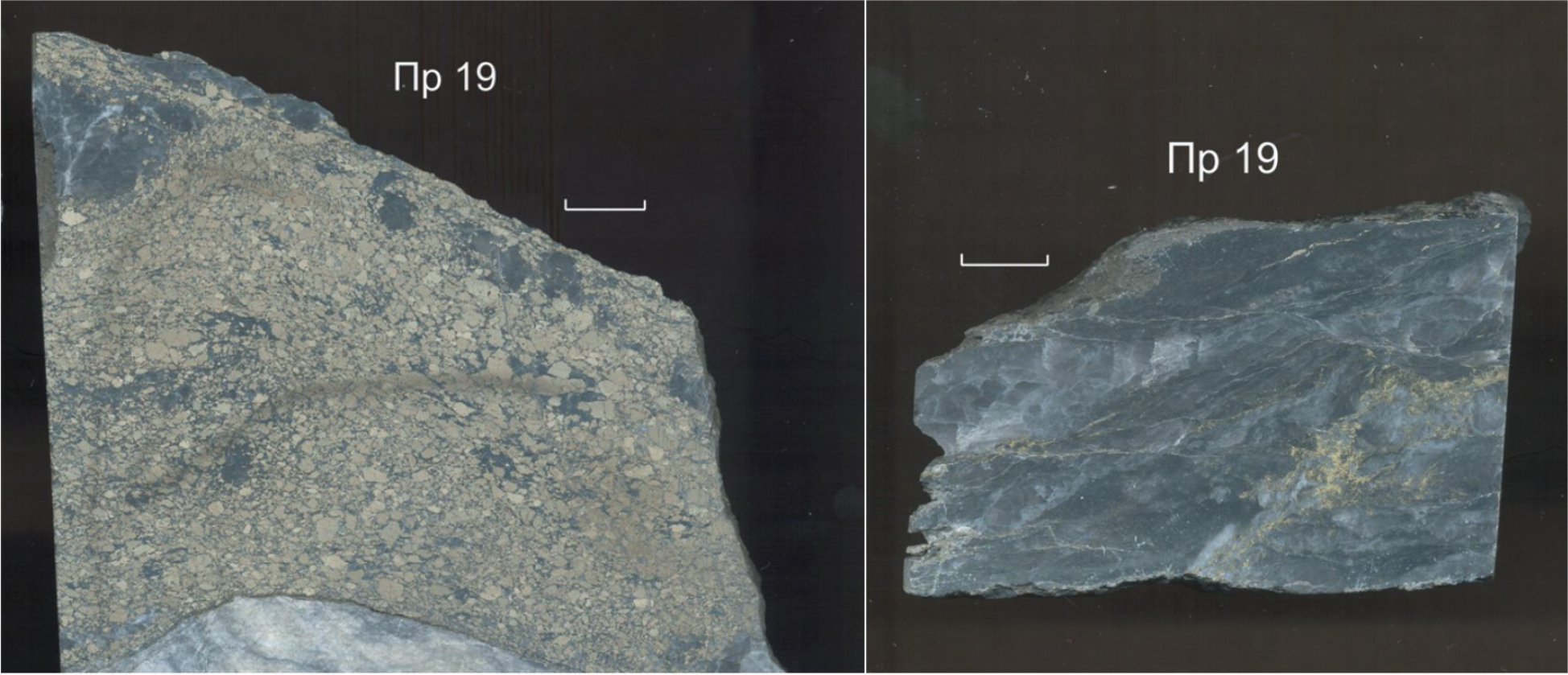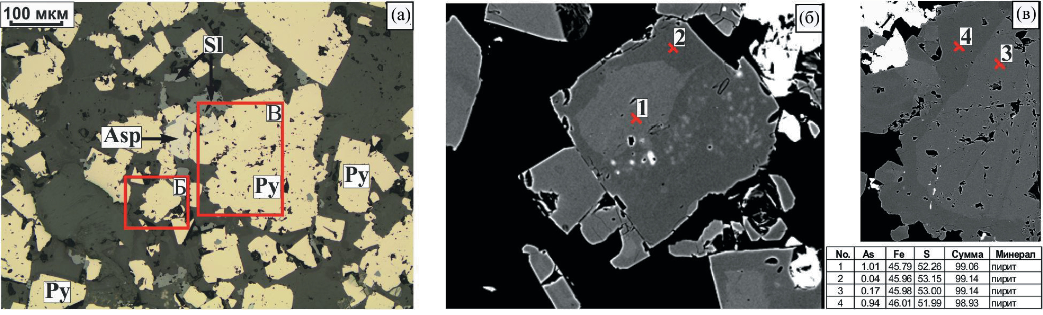 Исследования показали, что основным минералом рудных зон, за очень редким исключением, является крупнокристаллический пирит, который составляет основу рудных тел. Этот ранний пирит формирует сплошные скопления кристаллов разных размеров (от n до n × 10 мкм), формирующих субвертикальные изогнутые полосы, залегающие согласно с массивными окварцованными карбонатами. Эти полосы имеют конседиментационный облик, т.е. после своего отложения они деформировались вместе с вмещающими породами. Впоследствии этот пирит был катаклазирован в ходе дальнейших тектонических событий, частично растворен и сцементирован более поздними минеральными ассоциациями под действием гидротермального раствора. В результате ранний пирит представлен катаклазированными, перетертыми вдоль трещин (фиг. 3а), резорбированными, насыщенными включениями нерудных минералов и более поздними сульфидами (фиг. 3б) и сцементированными более поздними минеральными агрегатами.