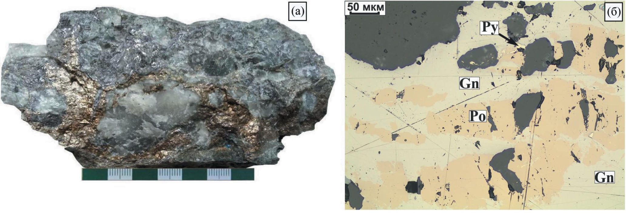 Фиг. 5. Пирротин-галенитовый агрегат. а – Пирротин-галенитовый агрегат цементирует округлые “будины” полупрозрачного кварца. б – реликты пирротина (Po) в крупном выделении галенита (Gn). Py – пирит. Обр. 1390кв26. Горизонт 1390.