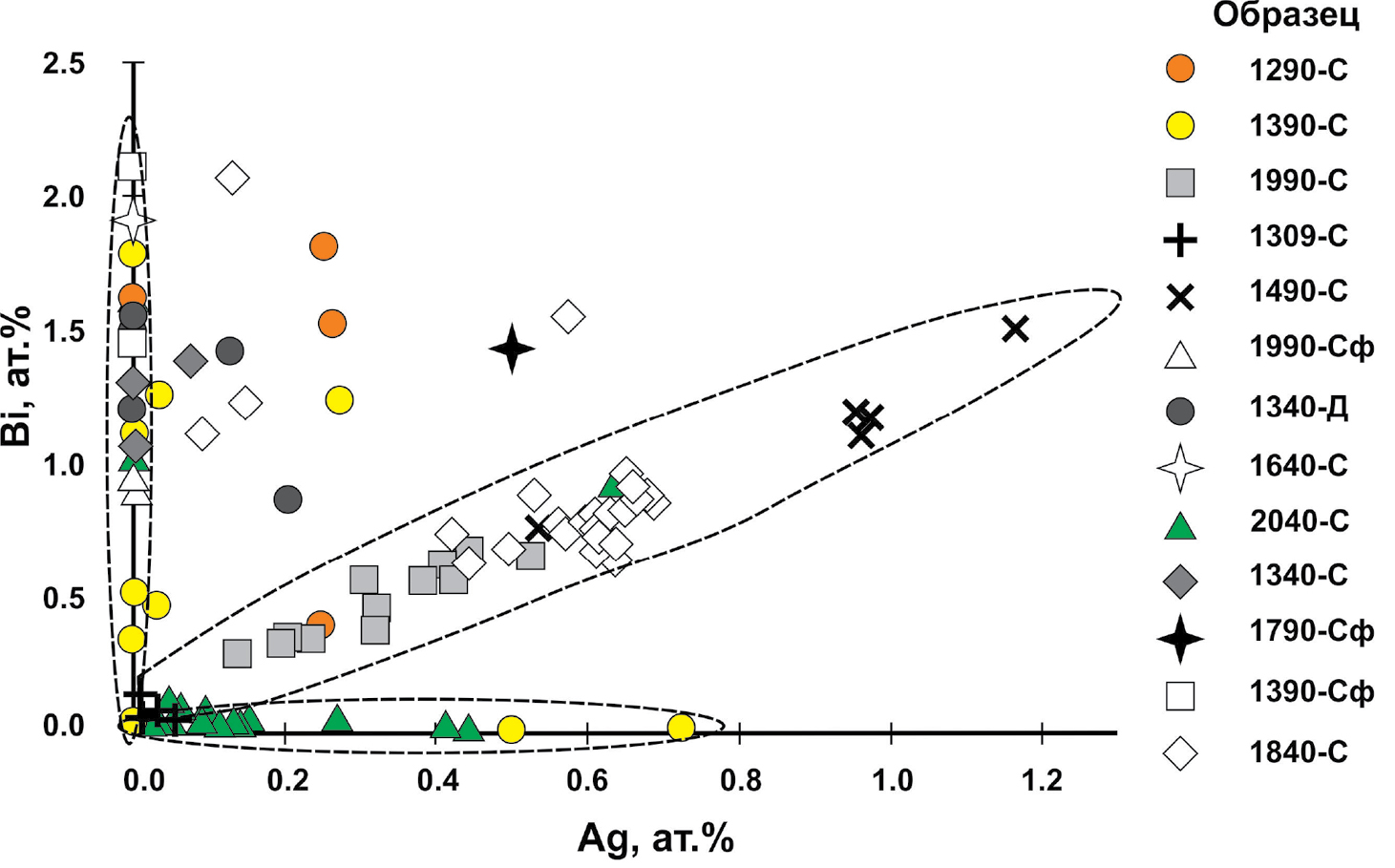 В химическом составе галенита отмечается часто встречающаяся примесь висмута. В некоторых образцах между висмутом и серебром в галените отмечается положительная корреляция, но в большинстве случаев висмут является единственным элементом-примесью, содержание которого достигает 7.8 мас.% (фиг. 8). Остальные значимые примеси, отмеченные в галените (Cu, Fe), связаны с захватом пучком прибора близлежащих минералов. Содержания химических элементов в галените варьируют: Pb — от 77.83 до 87.94 мас. %, S — от 12.71 до 16.64 мас. %, Ag — от 0 до 1.9 мас. %, Bi — от 0 до 7.8 мас. %, Cu — от 0 до 2.79 мас. %.
