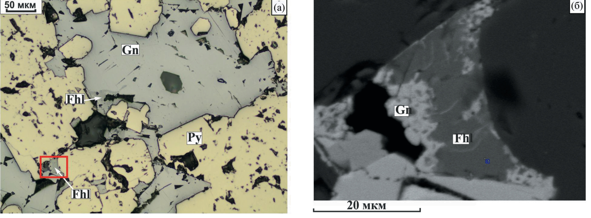 Фиг. 9. Галенит (Gn) выполняет межзерновые пространства и замещает ранний пирит (Py). В тесном срастании с галенитом находится блеклая руда (Fhl), которая обрастает и пересекается по микротрещинам галенитом. а – микрофотография, б – BSE изображение фрагмента (а). Обр. Пр 18. Горизонт 2060.