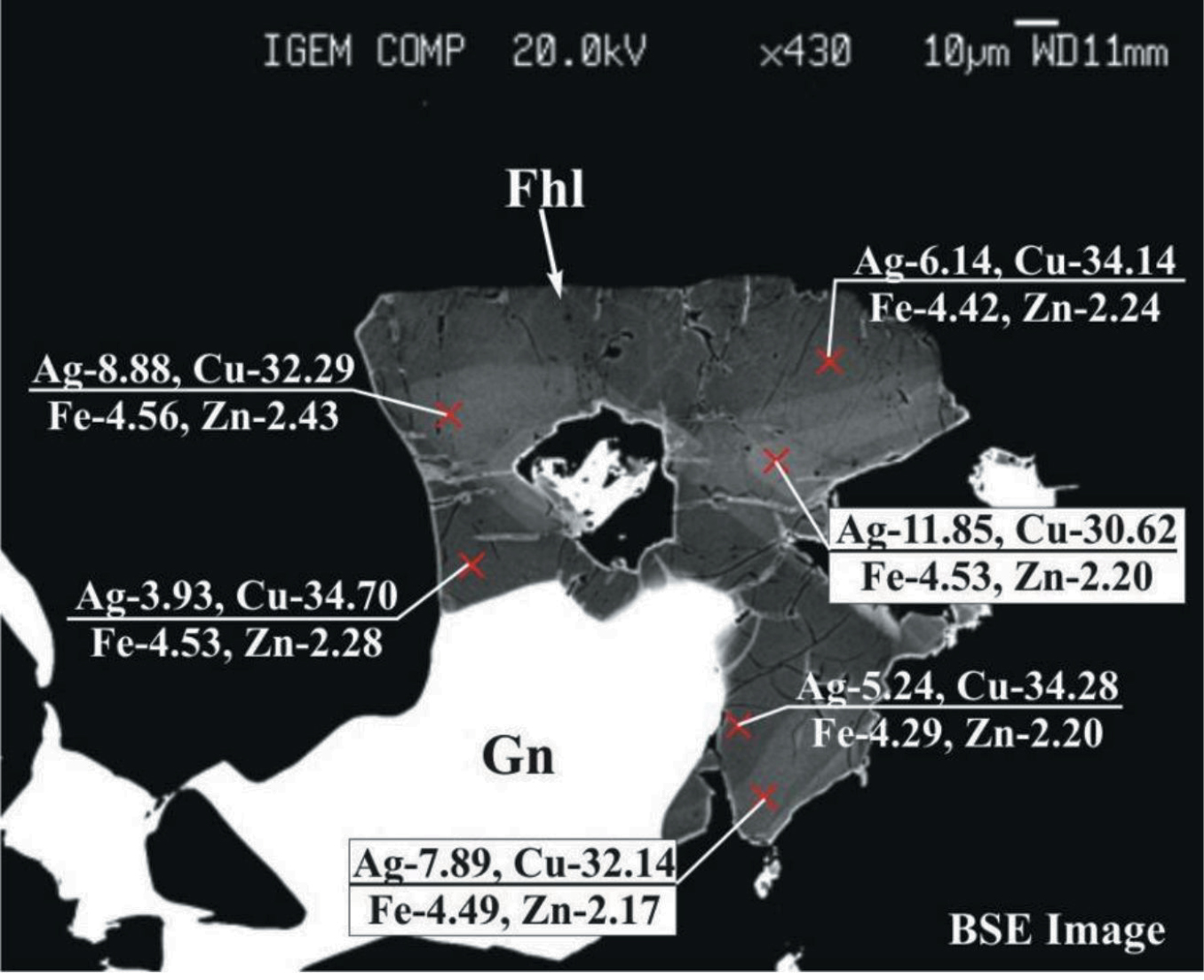 Можно отметить, что содержание серебра в блеклых рудах не зависит от глубины отбора, а зависит от ассоциации, в которую входят минералы этой группы. В составе полиметаллической ассоциации концентрация серебра не превышает 11.9 мас. %. В том случае, если тетраэдрит находится в тесном срастании с галенитом, который образует мелкие включения в пирите или нерудной матрице, содержание серебра варьирует от 19.7 до 26.5 мас. %. Во втором случае анализы не могут считаться количественными, т.к. выделения аргентотетраэдрита крайне малы и неизбежен захват пучком зонда близлежащих сред. В целом химический состав блеклых руд тетраэдрит-аргентотетраэдритовой серии варьирует в достаточно широких пределах: Ag — от 0.8 до 26.5 мас. %, Cu — от 17.5 до 36.8 мас. %, Fe — от 3.7 до 6.9 мас. %, Zn — от 0.1 до 2.5 мас. %, Sb — от 25.9 до 31.9 мас. %, S — от 22.3 до 25.4 мас. %. Из других примесей присутствуют Cd (до 0.72 мас. %), As (до 0.23 мас. %), Bi (до 0.18 мас. %). В минералах ряда блеклых руд соотношение Fe/(Fe + Zn) изменяется от 0.70 до 0.98, Ag/(Ag + Cu) — от 0.06 до 0.45.
