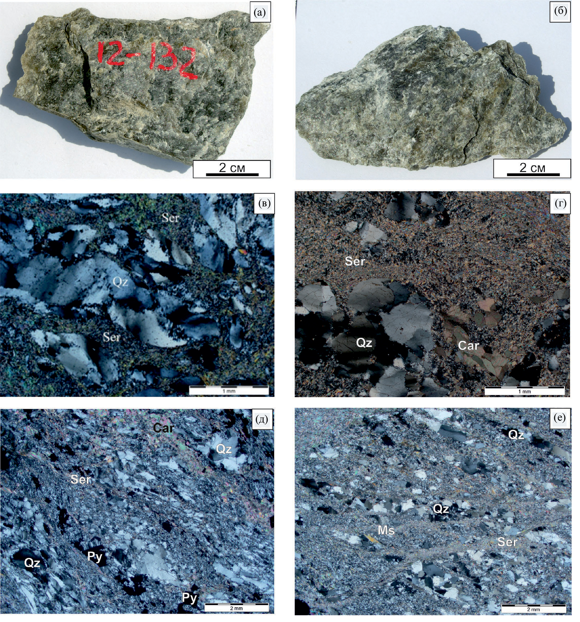 Изученные нами околорудные метасоматиты представляют собой сланцеватую породу зеленого цвета с характерным шелковистым мерцающим блеском на поверхностях сколов (фиг. 11а, б). По составу главных породообразующих минералов, по структурным и текстурным особенностям отобранные образцы оказались близки между собой. Главными породообразующими минералами в них являются кварц и серицит, общая доля которых может достигать 98%. В целом кварц преобладает над серицитом, хотя соотношение этих минералов существенно варьирует от образца к образцу (фиг. 11в, г). В подчиненном количестве присутствуют карбонаты (кальцит, доломит), альбит и, что реже, калиевый полевой шпат и хлорит (фиг. 11д, e). Пирит является единственным рудным минералом, который присутствует в заметных количествах (до 20%). Метасоматиты, как правило, обладают порфиробластовой структурой (фиг. 11в, г). Порфиробласты представлены преимущественно изометричными или линзовидными выделениями кварца и карбонатов, а также — ориентированными в одном направлении лейстами альбита. В метасоматитах, развитых по гранито-гнейсам гарганского комплекса, среди порфиробласт выявлены единичные зерна унаследованного мусковита (фиг. 11е). Крупные зерна кварца нередко деформированы и несут следы поздней перекристаллизации (фиг. 11д, е).