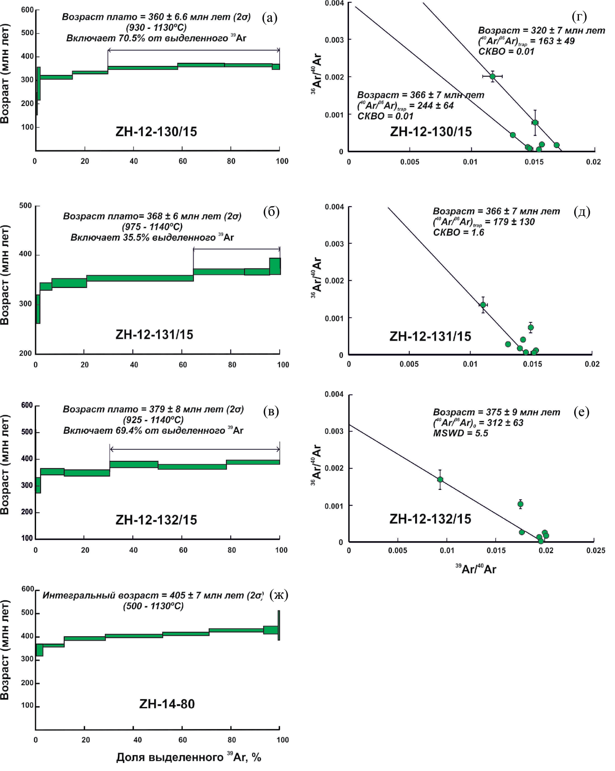 Результаты 40Ar-39Ar изучения серицита из метасоматитов представлены в Приложении 2, а также на диаграммах в виде возрастных спектров и “обратных” изохрон (фиг. 12). В целом проанализированные температурные фракции для всех образцов демонстрируют широкий разброс значений 40Ar/39Ar возраста (от 200 до 440 млн лет). В то же время образцы отличаются между собой по диапазонам, в пределах которых варьируют значения 40Ar/39Ar возраста. Наиболее узкие диапазоны 40Ar/39Ar возрастов получены для температурных фракций ZH-12—131/15 (290—378 млн лет, 8 ступеней от 500 до 1140оC, 100% от всего выделенного39Ar), ZH-14—80 (340—430 млн лет, 8 ступеней от 650 до 1070оC, 99.1% от всего выделенного 39Ar) и ZH-12—132/15 (302—397 млн лет, 7 ступеней от 500 до 1140оC, 100% от всего выделенного 39Ar), а самый широкий диапазон — для образца ZH-12—130/15 (200—365 млн лет, 8 ступеней от 500 до 1130оC, 100% от всего выделенного 39Ar).