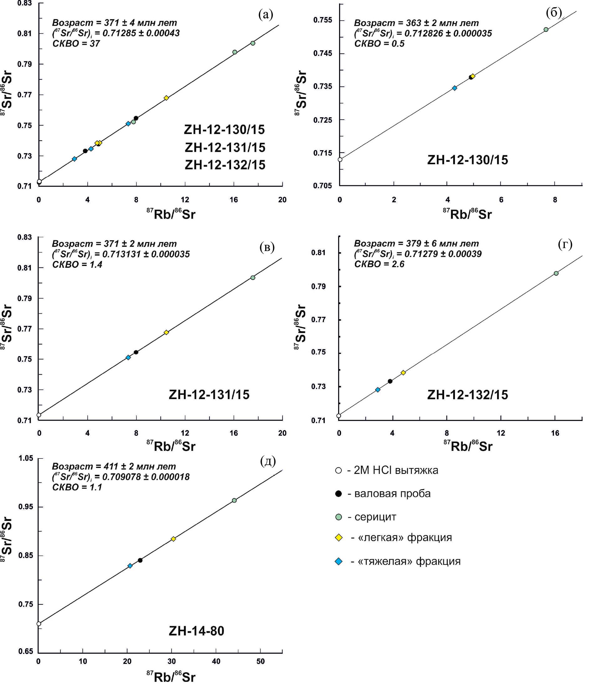 40Ar-39Ar и Rb-Sr датирование было проведено для кварц-серицитовых метасоматитов, развитых по гранодиоритам сумсунурского комплекса (ZH-12—130/15, ZH-12—131/15 и ZH-12—132/15) и гранито-гнейсам гарганского комплекса (ZH-14—80). Изученные образцы по гранодиоритам были отобраны из одной метасоматической зоны с интервалом отбора проб в 1 м.