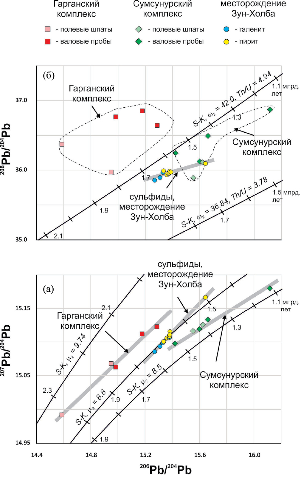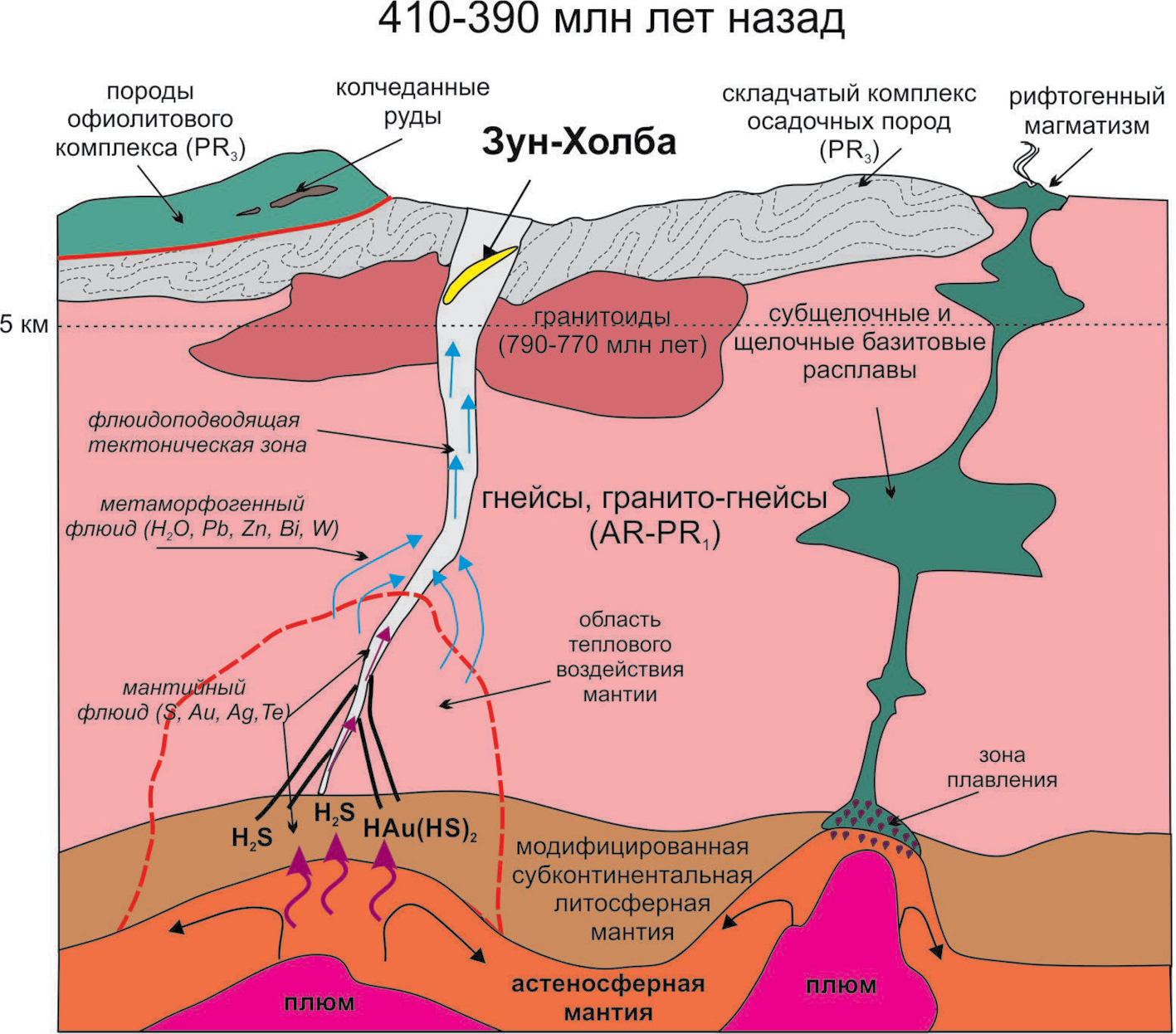 Преобладающие точки зрения на генезис месторождения Зун-Холба изложены в работах (Неймарк и др., 1995; Гордиенко и др., 2016; Damdinov et al., 2022). Согласно (Гордиенко и др., 2016), формирование золоторудной минерализации связано с неопротерозойско-раннепалеозойскими тектоно-магматическими процессами, которые развивались в условиях активной континентальной окраины. Источниками золота и других металлов и серы могли служить неопротерозойские рудоносные (сульфидные) ассоциации вулканогенно- осадочных пород и колчеданные руды подводных вулканических построек. Их тектоническая переработка, сопровождавшаяся метаморфическим преобразованием, по мнению этих исследователей, приводила к ремобилизации рудных компонентов и последующему их отложению с повышенными содержаниями золота в виде руд на месторождении Зун-Холба. Отчасти эта точка зрения подтверждается результатами изучения изотопного состава Pb в рудах месторождения и докембрийских гранитоидах региона. На основе полученных Pb-Pb данных Л.А. Неймарк с соавторами (Неймарк и др., 1995) пришли к выводу о позднеордовикском (~450 млн лет) возрасте руд, формирование которых было обусловлено раннепалеозойскими метаморфическими процессами переработки докембрийской коры региона. При этом основным источником поступления металлов в рудообразующую систему являлись породы позднеархейской континентальной коры. Метаморфогенная модель образования руд золота на месторождении Зун-Холба обосновывается и в работе (Damdinov et al., 2022). Обобщение геологических и минералогических особенностей месторождения, а также полученный комплекс данных о составе и распределении элементов-примесей в пирите из рудных тел и результаты изучения вариаций изотопного состава кислорода, углерода и серы в жильных и рудных минералах позволили Б.Б. Дамдинову с соавторами (Damdinov et al., 2022) отнести месторождение Зун-Холба к орогенному типу. Согласно приведенным в работе оценкам, отложение руд золота происходило на глубинах в 3—4 км и температурах 380—433оC при ведущей роли метаморфогенного флюида. В качестве источника последнего рассматривается океаническая кора, субдуцированная под Тувинско-Монгольский микроконтинент в неопротерозойское время. Собственно, источником серы и большинства металлов, включая и золото, по мнению авторов, являлась сульфидная минерализация, пространственно и генетически ассоциирующая с позднедокембрийскими офиолитовыми комплексами.