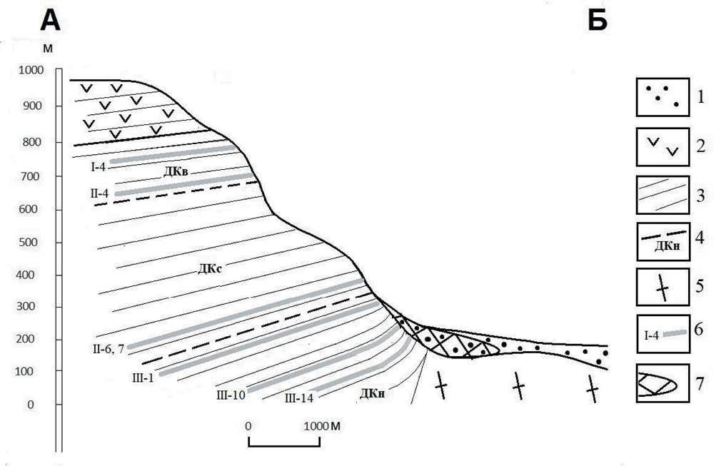 Фиг. 2. Схематический обобщенный разрез северо-западного фланга Ловозерского массива по линии АБ (фиг. 1) по данным (Герасимовский и др., 1966; Буссен, Сахаров, 1972; Когарко, 2002; Пожиленко и др., 2002; Лаломов и др., 2019). 1 – четвертичные отложения делювиально-пролювиального и горно-ледникового генезиса; 2 – комплекс эвдиалитовых луявритов; 3 – дифференцированный лопаритоносный комплекс луявритов-фойяитов-уртитов; 4 – границы серий дифференцированного комплекса (ДКн – нижняя серия, ДКс – средняя серия, ДКв – верхняя серия); 5 – вмещающий докембрийский гранито-гнейсовый комплекс; 6 – рудные горизонты массива; 7 – россыпи лопарита.