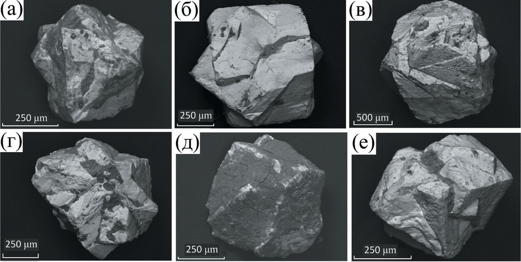 Фиг. 5. Морфологические разновидности зерен лопарита-1 Сергеваньской россыпи: а, д – сочетания кубических и октаэдрических форм; б – двойник кубических кристаллов; в – двойники кубических кристаллов с частичными сколами; г, е – двойники кристаллов по флюоритовому закону (по грани 111). Тяжелая фракция, изображение в отраженных электронах.