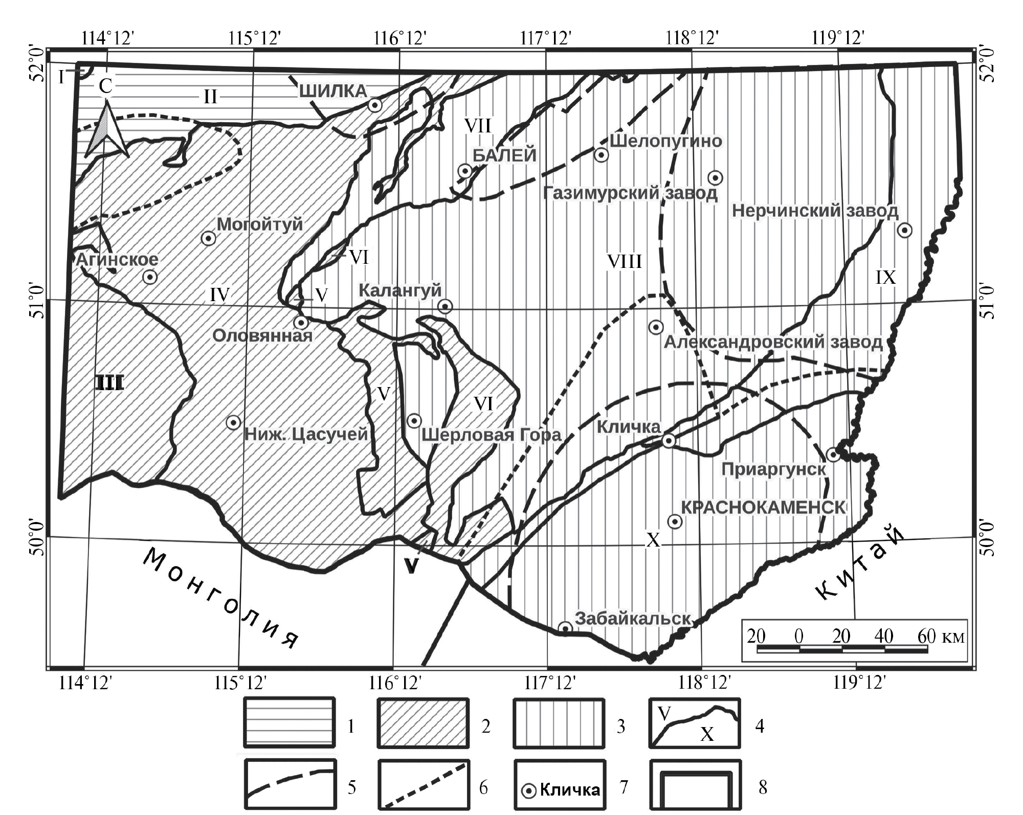 Фиг. 1. Схема тектонического районирования юго-восточного Забайкалья (Государственная …, 2010): 1 – Селенгино-Яблоновая складчатая область; 2 – Агинская мегазона Монголо-Охотской складчато-надвиговой системы; 3 – Аргунский террейн Керулено-Аргуно-Мамынского композитного супертеррейна; 4 – границы тектонических таксонов и их номера: I – Хилок-Витимский блок, II – Пришилкинский блок, III – Среднеононский террейн, IV – Ононский террейн, V – Уртуйский террейн, VI – Борзинский террейн, VII – Борщовочный блок, VIII – Газимурский блок, IX – Калга-Орочинский блок, X – Заурулюнгуйский (Урулюнгуйский) блок; 5 – позднеюрские структурно-фациальные зоны; 6 – средне-позднеюрские фациальные зоны; 7 – населенные пункты и их названия; 8 – контур площади листа карты M-50.