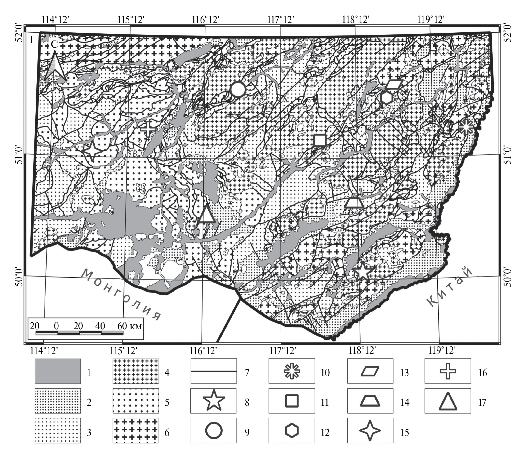 Фиг. 2. Основные геологические формации и крупнейшие месторождения территории юго-восточного Забайкалья (Государственная …, 2010): 1 – N–Q осадочные отложения, 2 – меловые вулканогенно-осадочные комплексы, 3 – юрские вулканогенно-осадочные комплексы, 4 – PZ–MZ гранитоидные интрузии, 5 – PZ вулканогенно-осадочные комплексы, 6 – AR–PZ1 гранито-гнейсы и комплексы магматических пород, 7 – разрывные нарушения, 8–17 – рудные поля и месторождения (вне масштаба) с основными извлекаемыми рудными элементами: 8 – Стрельцовское рудное поле (19 месторождений – U, Mo), 9 – Балейское рудное поле (Балейское и Тасеевское месторождения – Au), 10 – Березовское месторождение (Fe), 11 – Бугдаинское месторождение (Mo, Pb, Au, Ag), 12 – Быстринское месторождение (Au, Ag, Cu, Fe), 13 – Ново-Широкинское месторождение (Au, Ag, Pb, Zn, Cu, Cd, Sb, Bi), 14 – месторождение Нойон-Тологой (Zn, Pb, Au, Ag, Sb, Cd, S), 15 – Орловское месторождение (Ta, Li), 16 – Уронайское месторождение (Bi, Au), 17 – Шерловогорское месторождение (Sn, Zn, Pb, Be, Ag, In, Sc).