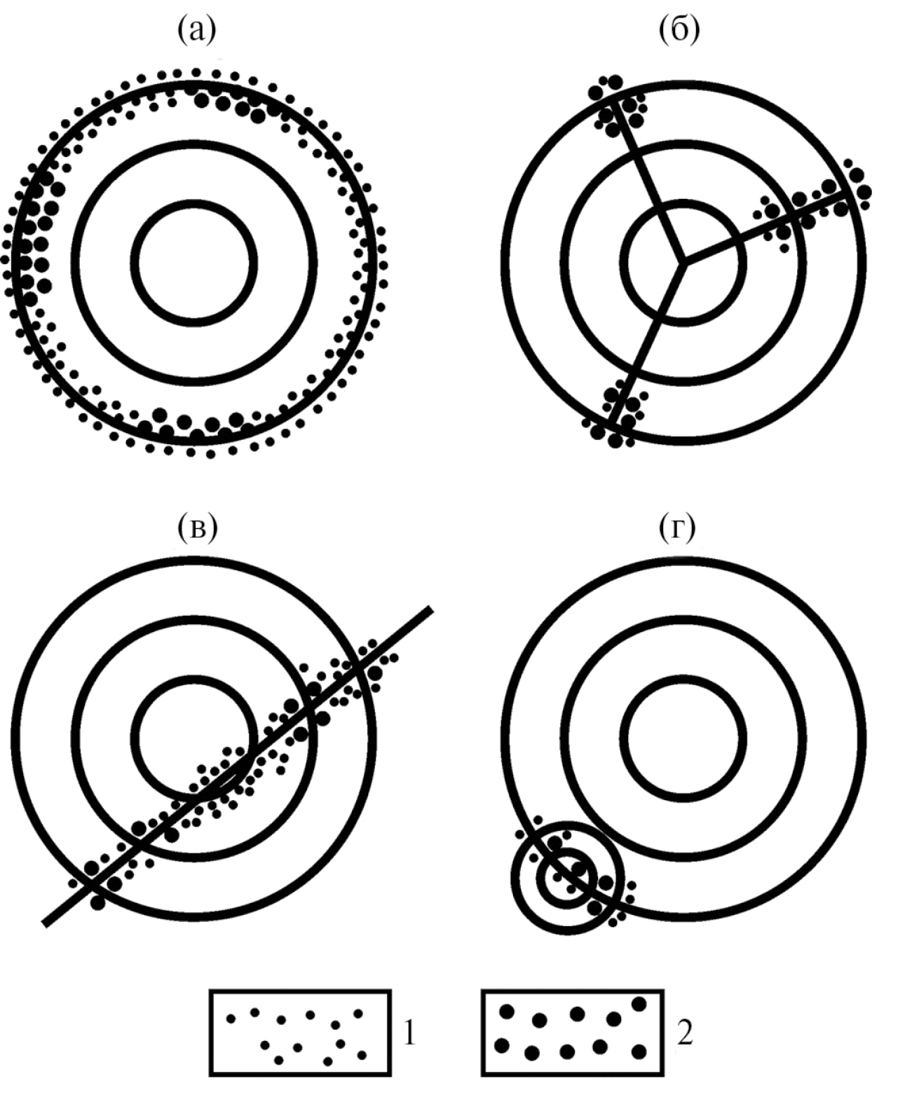 Фиг. 6. Принципиальная схема локализации полезных ископаемых в пределах СЦТ (Соловьёв, 1978) с указанием наиболее вероятных областей локализации рудного вещества: в зоне внешних концентрических блоков (а), в каркасных узлах (б), в зонах секущих разломов (в), в участках структурной интерференции (г); 1 – рудопроявления, 2 – месторождения.