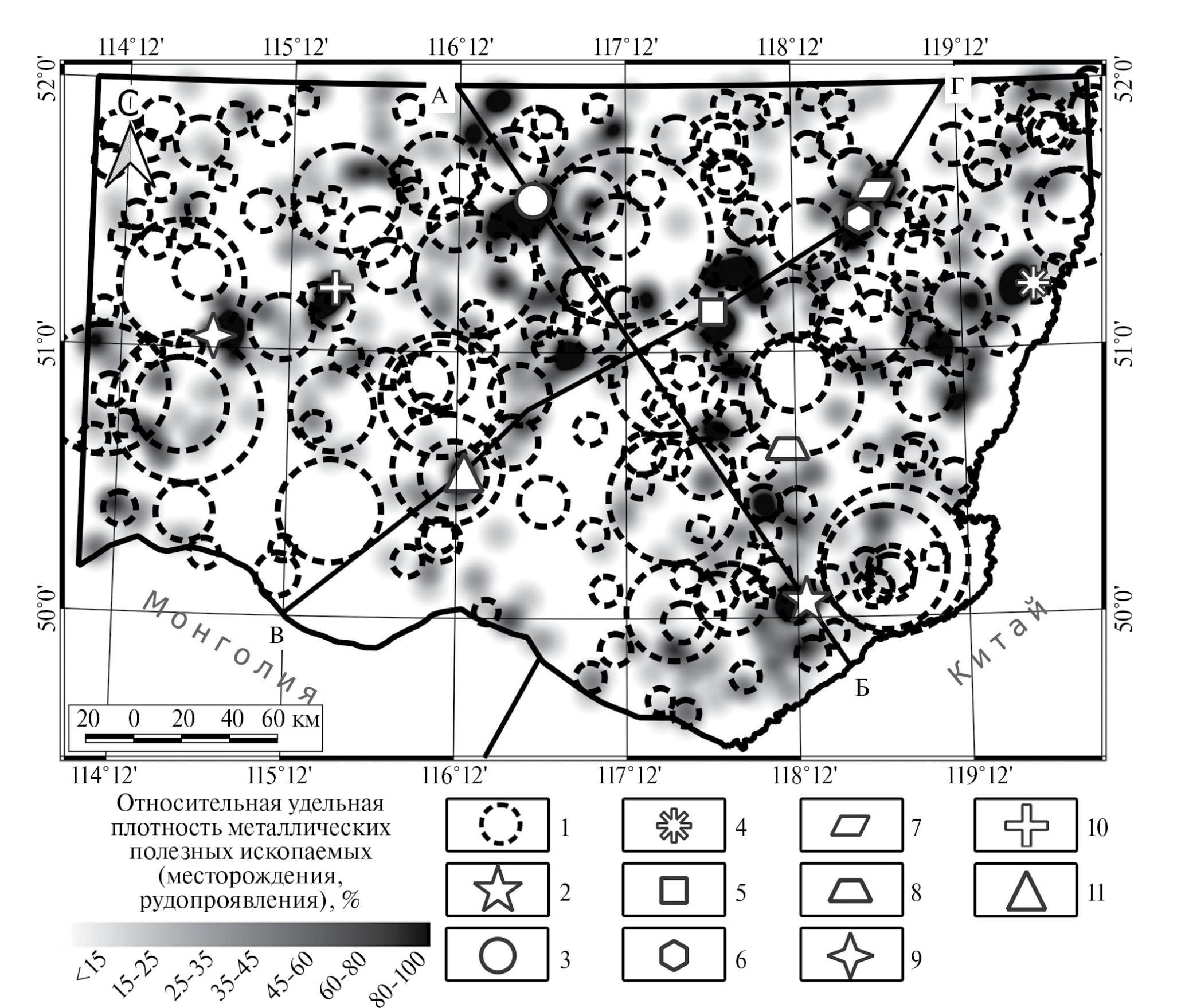 Фиг. 8. Схема локализации выявленных морфоструктур центрального типа (более 10 км в диаметре) относительно максимумов удельной плотности металлических полезных ископаемых (месторождения, рудопроявления): А–Б, В–Г – линии разрезов; 1 – морфоструктуры центрального типа; крупнейшие рудные поля и месторождения (вне масштаба): 2 – Стрельцовское рудное поле (19 месторождений – U, Mo), 3 – Балейское рудное поле (Балейское и Тасеевское месторождения - Au), 4 – Березовское месторождение (Fe), 5 – Бугдаинское месторождение (Mo, Pb, Au, Ag), 6 – Быстринское месторождение (Au, Ag, Cu, Fe), 7 – Ново-Широкинское месторождение (Au, Ag, Pb, Zn, Cu, Cd, Sb, Bi), 8 – Месторождение Нойон-Тологой (Zn, Pb, Au, Ag, Sb, Cd, S), 9 – Орловское месторождение (Ta, Li), 10 – Уронайское месторождение (Bi, Au), 11 – Шерловогорское месторождение (Sn, Zn, Pb, Be, Ag, In, Sc).