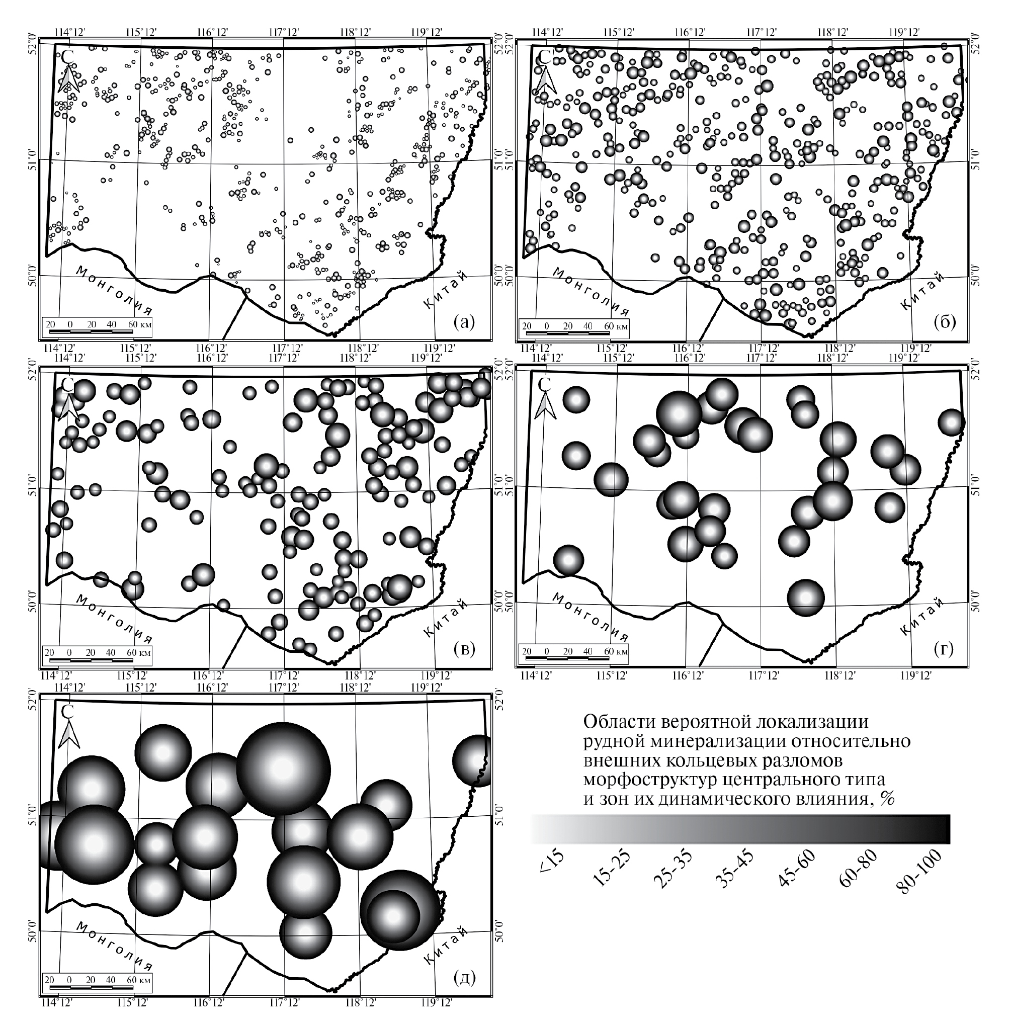 С помощью ГИС-технологий и пространственного анализа появляется уникальная возможность учета выявленных В.В. Соловьевым и другими исследователями наиболее благоприятных условий и областей для локализации рудного вещества относительно структурных элементов СЦТ. Одним из главнейших критериев является преимущественная приуроченность рудных объектов к внешним кольцевым разломам морфоструктур (Соловьев, 1978). Также определялась зона динамического влияния внешних кольцевых разломов, которая, наиболее вероятно, находится в линейной зависимости от параметров рассматриваемой структуры – чем больше диаметр, тем шире зона влияния. Для этого проведено ранжирование всех выделенных структур на пять классов, количество которых подбиралось эмпирически. При этом, учитывая факт, что пространственное наложение СЦТ одного класса может быть связано с различными процессами, разнесенными во времени, каждая структура рассматривается нами как отдельный объект. Таким образом, созданы схемы, отражающие вероятность локализации рудной минерализации относительно внешних кольцевых разломов СЦТ (фиг. 11).