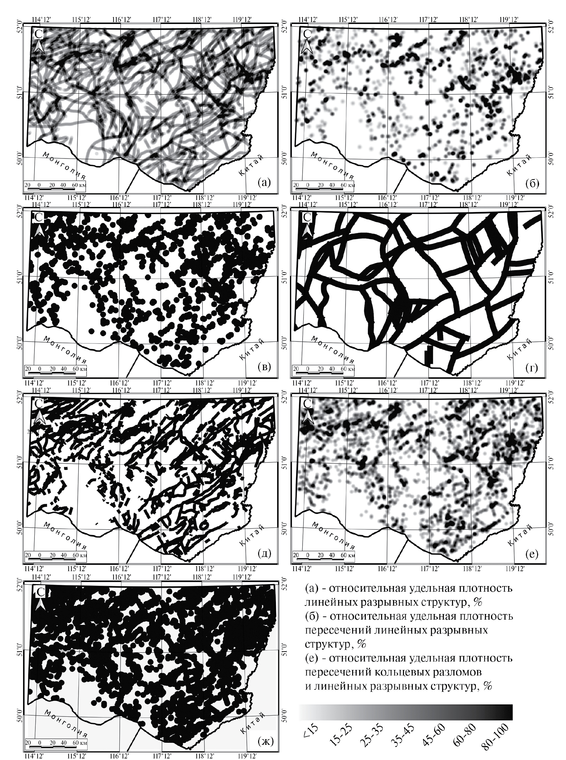 Следующей задачей являлось создание схем относительной удельной плотности известных рудных объектов по типу минерализации с указанием выделенных СЦТ для пространственного анализа с целью выявления связи структур с рудообразующими системами определенных типов. Установлено, что золоторудные объекты локализованы преимущественно в северной (БРП и многочисленные рудопроявления) и северо-восточной частях территории (фиг. 9а); урановорудные большей частью – на юго-востоке (СРП и многочисленные рудопроявления) (фиг. 9б); свинцово-цинковые объекты, крупнейшим из которых является месторождение Нойон-Тологой, а также крупные месторождения комплексных руд (Ново-Широкинское, Бугдаинское) располагаются в восточной части (фиг. 9в); максимумы пространственной плотности меди связаны в основном с небольшими рудопроявлениями, порфировыми и комплексными месторождениями (Ново-Широкинское, Бугдаинское, Быстринское), известными на исследуемой площади (фиг. 9г); сурьма, олово и вольфрам известны повсеместно в пределах территории и локализованы в качестве отдельных рудопроявлений и небольших месторождений (фиг 9д–ж); молибден в основном связан с небольшими рудопроявлениями, является попутным компонентом при извлечении из руд СРП, а также добывался на крупном Шахтаминском месторождении, которое выражено самым большим максимумом пространственной плотности в север-северо-восточной части территории (см. фиг. 9з).