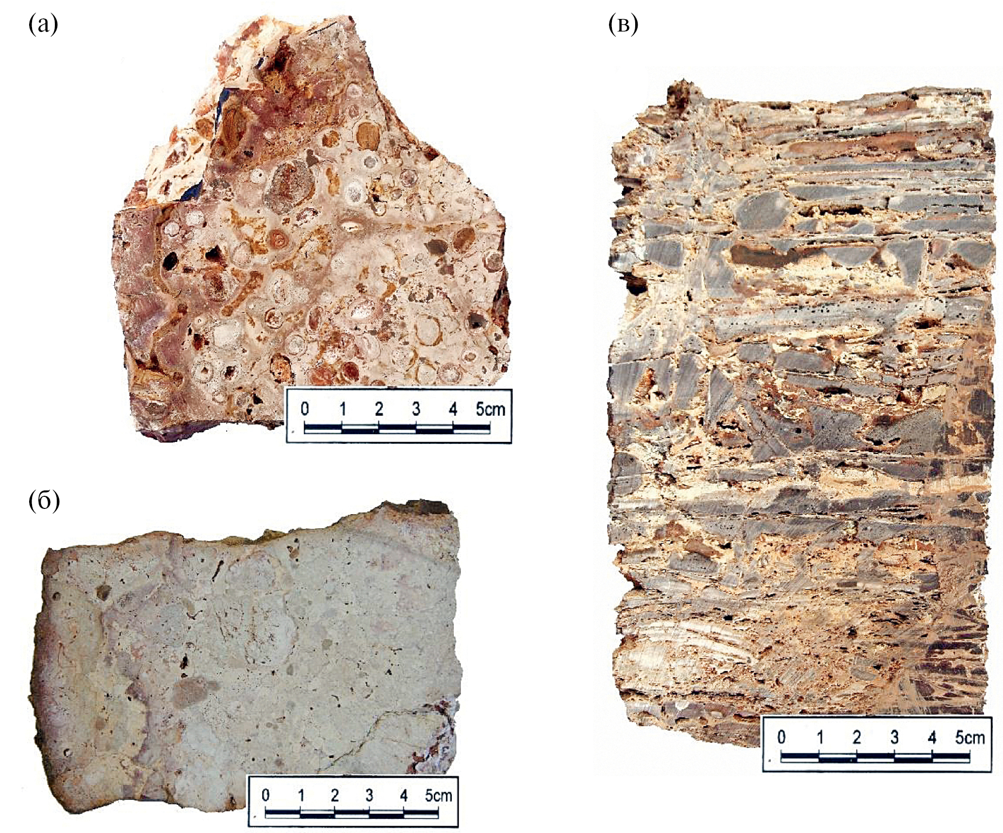 Фиг. 7. Осадочно-латеритные бокситы: а – боксит конгломератовый по отложениям серии Сангареди, б – гравелит-боксит по отложениям серии Сангареди, в – боксит песчаниковидный по отложениям серии Сангареди.