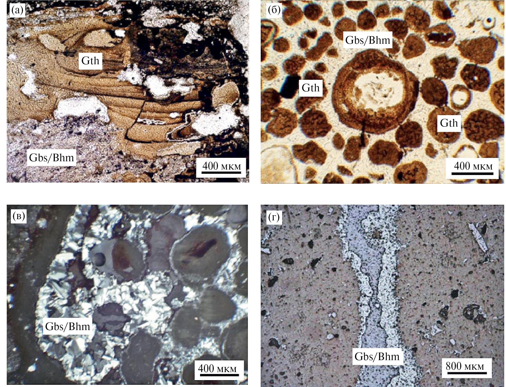 Фиг. 6. Химически преобразованый гелеморфный боксит: а – афанитовая структура; б – оолитовая структура, в – крупные гиббситовые кристаллы, г – вторичная гелефикаия по трещине. Прозрачный шлиф (Ник. +, Gbs – гиббсит, SiO2 – кварц, Bhm – бёмит, Gth – гётит, Hem – гематит)
