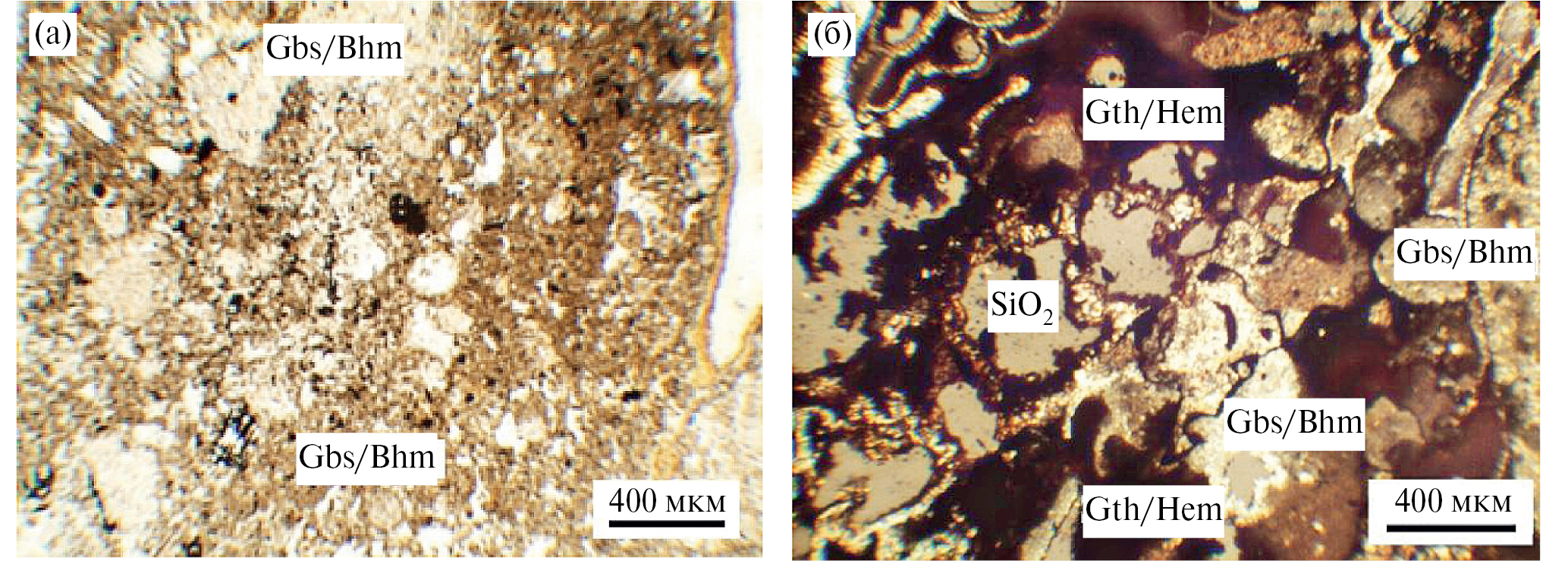 Псевдоморфные бокситы обладают массивной текстурой и микро-, мелкокристаллической структурой (фиг. 4а). Для них характерна унаследованная структура исходных долеритов. По зернам плагиоклаза развивается гиббсит. Гётит и гематит имеют удлиненные и изометричные формы. Гелефикация бокситов проявляется в развитии сгусткоподобных выделений алюмогеля. Участками они раскристаллизованы в тонкозернистый гиббсит (фиг. 4б). За счет гелефикации аподолеритовых бокситов, практически непрозрачных в проходящем свете, нарушается реликтовый рисунок офитовой структуры, из-за чего он читается с трудом. В некоторых шлифах наблюдается развитие вторичного гиббсита по стенкам трещин и каверн.