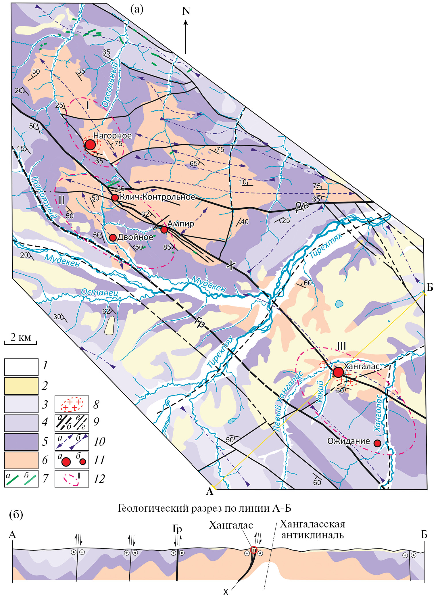 Фиг. 2. Схема геологического строения Хангаласского рудного узла (а) и геологический разрез по линии А–Б (б).