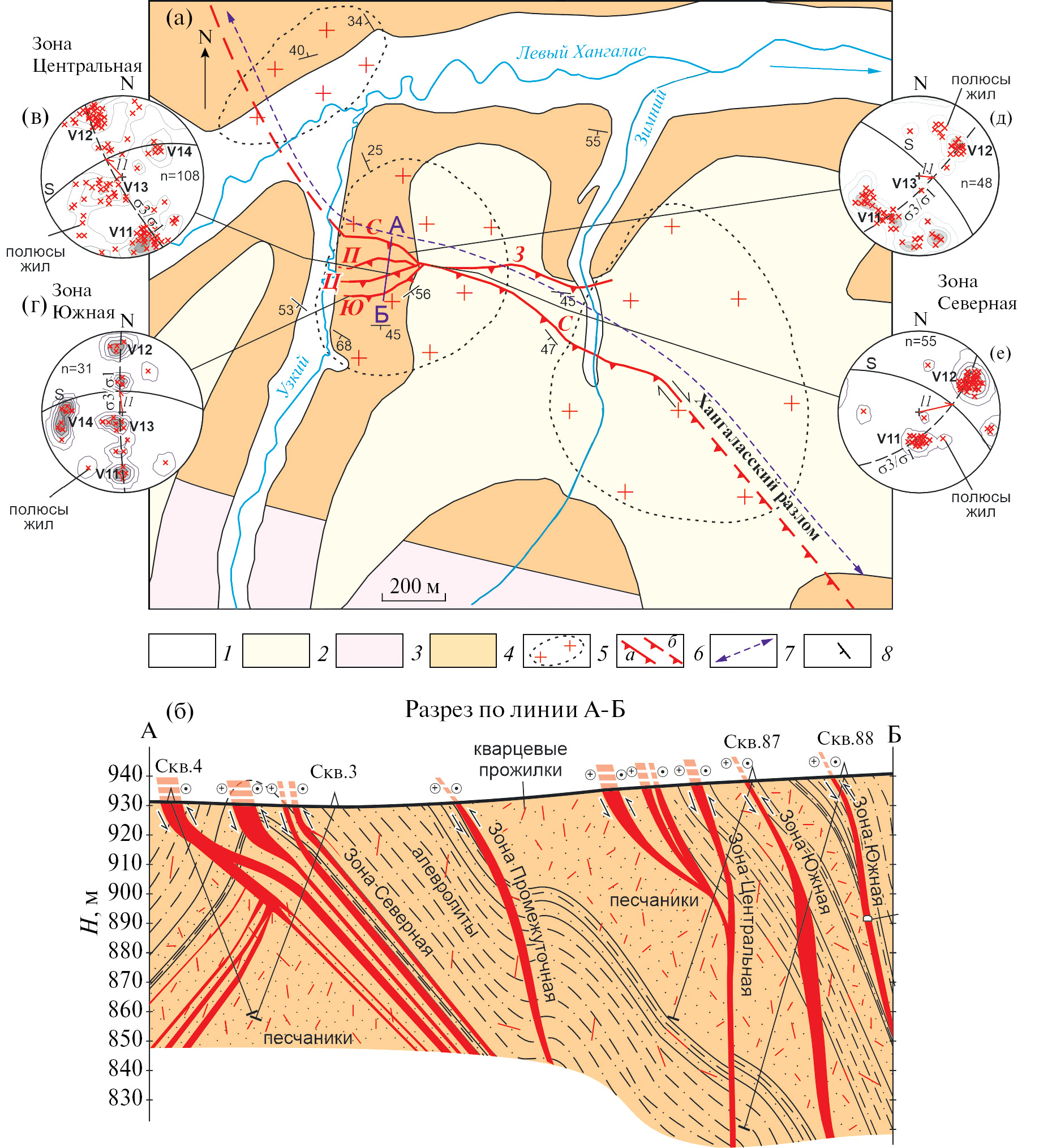 Фиг. 3. Схема геологического строения (а), геологический разрез (б), стереограммы полюсов кварцевых жил (в–е) месторождения Хангалас (Fridovsky et al., 2018).