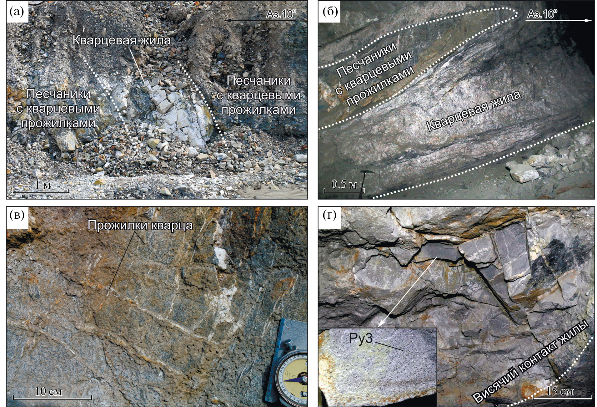 а–б – кварцевая жила: a – канава 50, б – штрек 2, горизонт 920 м; в – прожилки кварца в песчанике, канава 50; г – прожилково-вкрапленная минерализация в околорудных метасоматитах висячего контакта кварцевой жилы, штрек 1, горизонт 920 м.