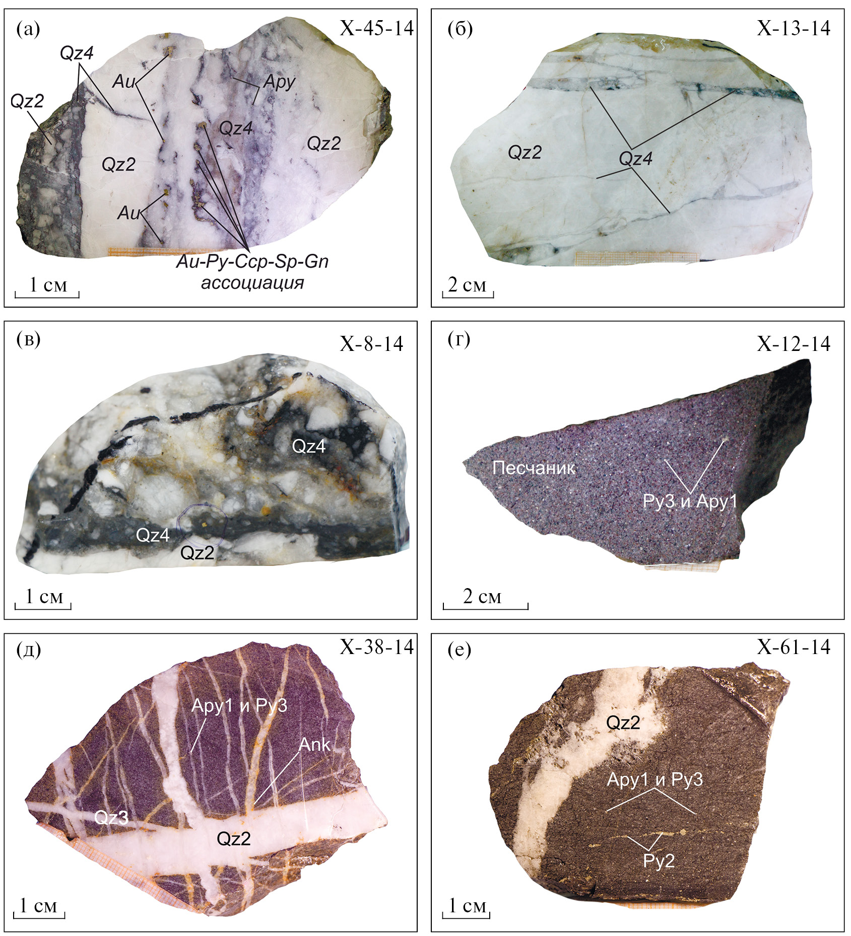 а – комбинация брекчиевидной и полосчатой текстур, обусловлена цементацией обломков молочно-белого кварца-2 (Qz2) халцедоновидным темно-серым кварцем-4 (Qz4) и чередованием их полос и цепочек рудных минералов вдоль полос пелитового материала; б – прожилковая текстура, сформирована прожилками серого халцедоновидного кварца-4 (Qz4) в молочно-белом кварце-2 (Qz2); в – брекчии с обломками кварца-2 (Qz2), сцементированными кварцем-4 (Qz4); г – песчаники с вкраплениями пирита-3 (Ру3) и арсенопирита-1 (Ару1); д – ориентированно-прожилковые текстуры метасоматитов с вкраплениями пирита-3 (Ру3) и арсенопирита-1 (Ару1); е – песчаник с прожилками кварца-2 (Qz2) и вкраплениями пирита-3 (Ру3) и арсенопирита-1 (Ару1).