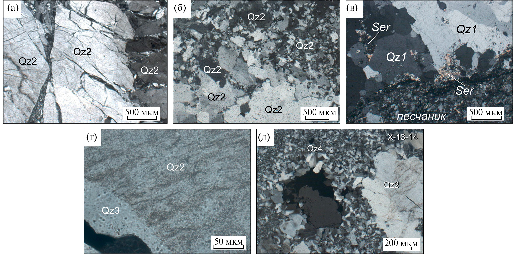 а – микротекстуры дробления и цементации кварца-2 (Qz2); б – поликристалличность с изрезанными лапчатыми контурами индивидов и проявление сутурных границ кварца-2 (Qz2); в – серицит, приуроченный к зальбанду прожилков кварца-1 (Qz1); г – прожилки кварца-3 (Qz3), рассекающие кварц-2 (Qz2); д – поздний халцедоновидный кварц-4 (Qz4), цементирующий обломки кварца-2 (Qz2).