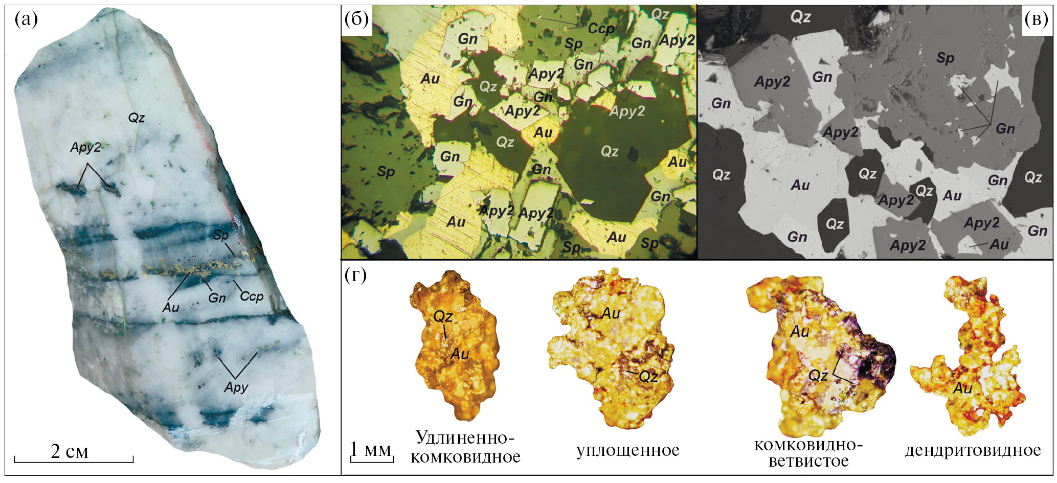 а – полосчатый кварц (Qz) с включениями самородного золота (Au), галенита (Gn), сфалерита (Sp) и арсенопирита (Apy2); б–в – срастание золота (Au), галенита (Gn), сфалерита (Sp) и халькопирита (Cсp) и ангедрального арсенопирита-2 (Apy2); б – отраженный свет; в – обратно-рассеянные электроны.