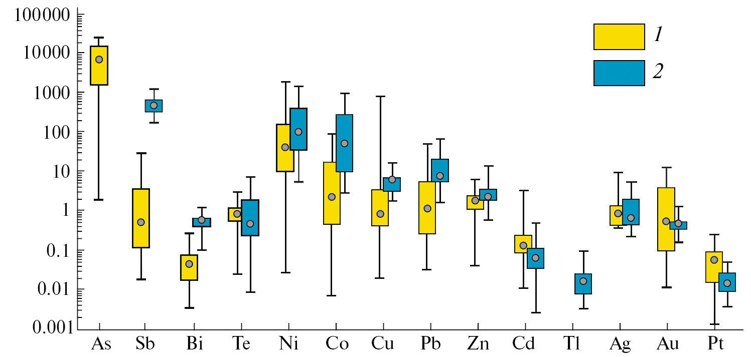 Элементы-примеси пирита и арсенопирита из околорудных метасоматитов месторождения исследовали методом ЛА-ИСП-МС (68 анализов) с помощью лазерной абляционной системы LA UP-213 фирмы New Wave Research (США), сочлененной с квадрупольным масс-спектрометром Agilent 7700x фирмы Agilent Technologies (США) (аналитик Д.А. Артемьев, Институт минералогии УрО РАН, г. Миасс) по методике, приведенной в (Kudrin et al., 2021).