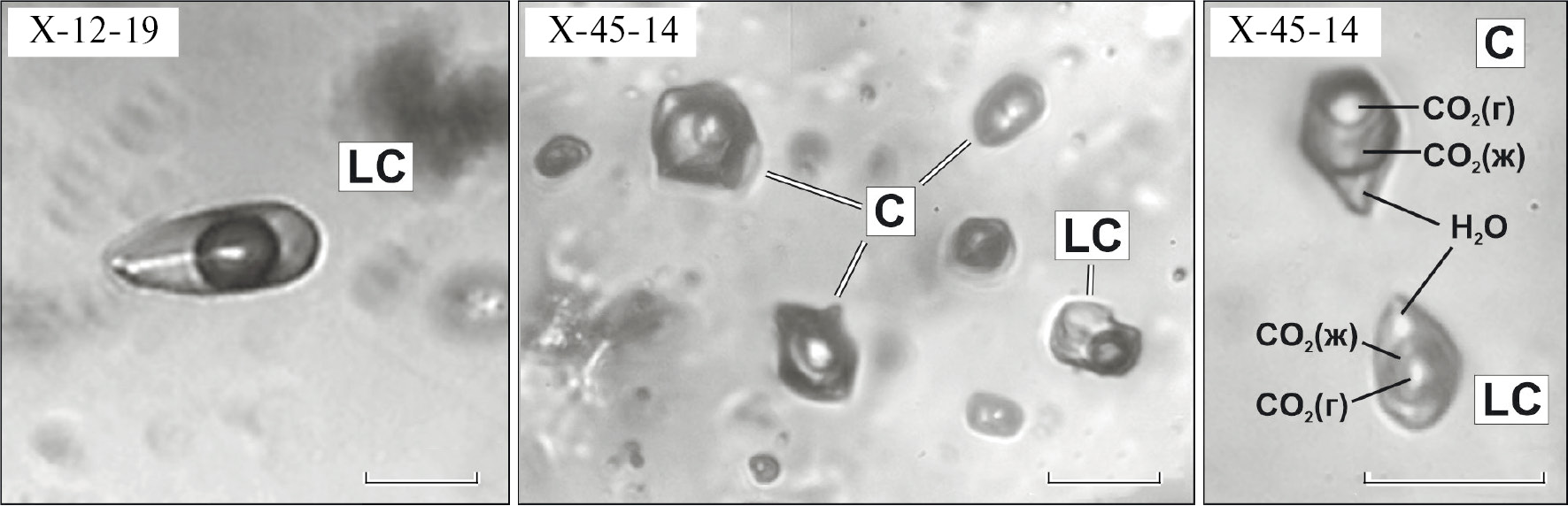 Микротермометрические исследования флюидных включений (ФВ) в 10 образцах осуществлены в ЦНИГРИ и СВКНИИ ДВО РАН по стандартной методике (Реддер, 1987). Валовый анализ химического состава флюидных включений выполнен в ЦНИГРИ по методике (Кряжев и др., 2006).