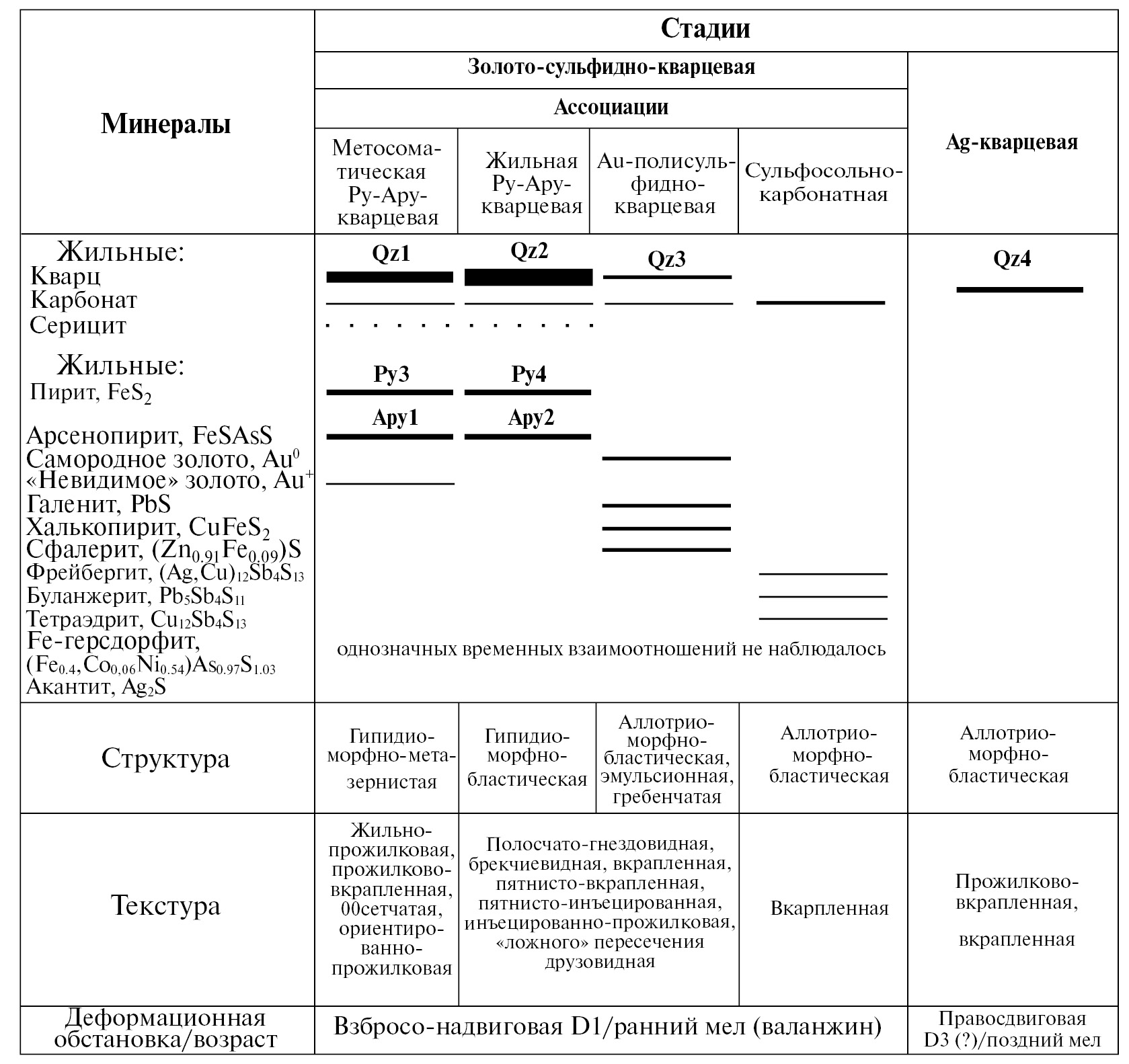 Вкрапленное золото-сульфидное оруденение с преимущественно “невидимым” золотом сопровождает жильно-прожилковые тела и минерализованные зоны дробления (см. фиг. 4в–г). Метасоматические изменения в околорудных терригенных породах имеют серицит-карбонат-кварцевый состав с пиритом и арсенопиритом и типичны для березитов. Метасоматический кварц формирует систему маломощных прожилков в призальбандовых частях рудных тел. Наряду с мономинеральными (кварцевыми), наблюдаются прожилки кварц-карбонатного и кварц-сульфидного состава. Серицит развивается в цементе пород, реже в межзерновом пространстве, в микротрещинах и в самих зернах кварца в виде агрегатов и отдельных чешуй размером первые микроны. Содержание сульфидов в метасоматитах достигает 1–3%, реже до 5%. Главными рудными минералами являются пирит и арсенопирит, редко в виде микровключений в них встречаются галенит, сфалерит, халькопирит, самородное золото, Fe-герсдорфит, тетраэдрит, аргентотеннантит. Во внешних зонах метасоматитов преобладает пирит. Содержание Au в монофракциях пирита и арсенопирита колеблется от 0.76 до 39.3 и от 12.3 до 23.8 г/т соответственно, а в метасоматитах – от долей до 5.29 г/т, в среднем 0.81 г/т.