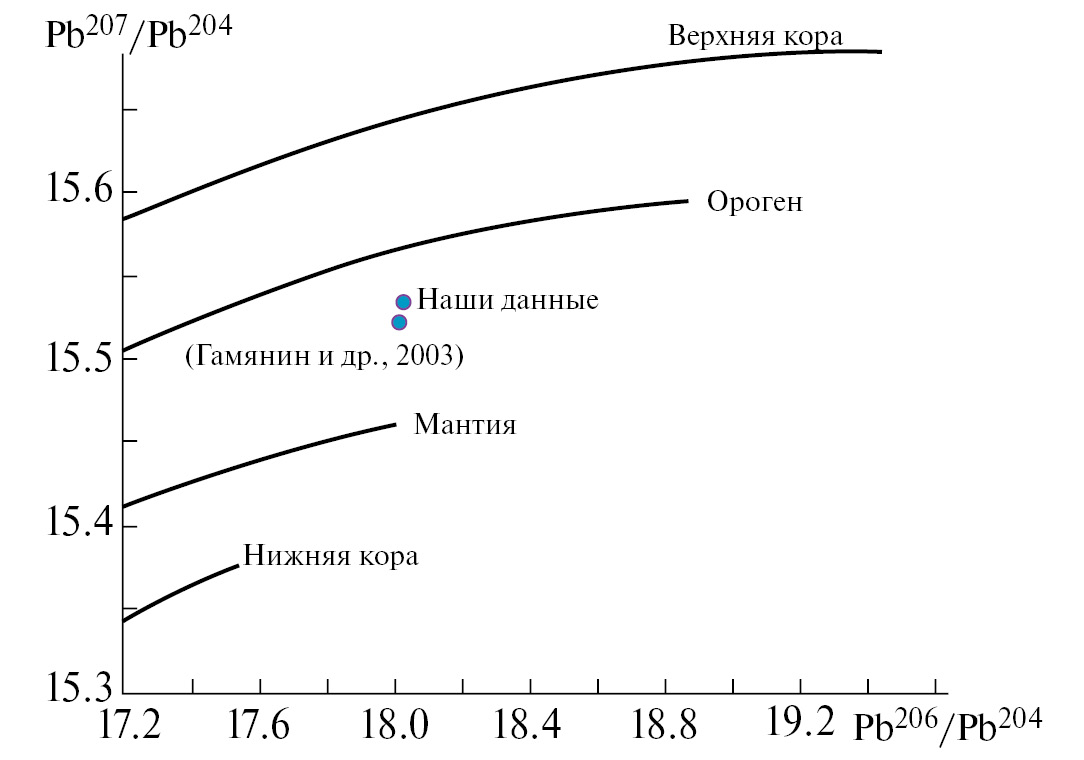 Исследованы Re–Os изотопная система самородного золота, изотопный состав серы δ34S сульфидов (16 анализов), кислорода δ18O кварца (5 анализов) и благородных газов (40Аr/36Ar, 3He/4He, 20Ne) в газово-жидких включениях в кварце (2 анализа). Методика изучения Re–Os изотопной системы самородного золота приводится в (Фридовский и др., 2021), изотопного состава серы (δ34S) сульфидов, кислорода в кварце – в (Kudrin et al., 2021). Изотопный состав благородных газов (40Аr/36Ar, 3He/4He, 20Ne) в газово-жидких включениях кварца определен в Центре изотопных исследований Всероссийского научно-исследовательского геологического института им. А.П. Карпинского (ВСЕГЕИ, г. Санкт-Петербург), следуя методикам, описанным в (Прасолов, 1990). Pb–Pb изотопные иссследования проведены в Институте геологии рудных месторождений, петрографии, минералогии и геохимии РАН (ИГЕМ РАН, г. Москва) по методике, опубликованной в (Чернышев и др., 2007).