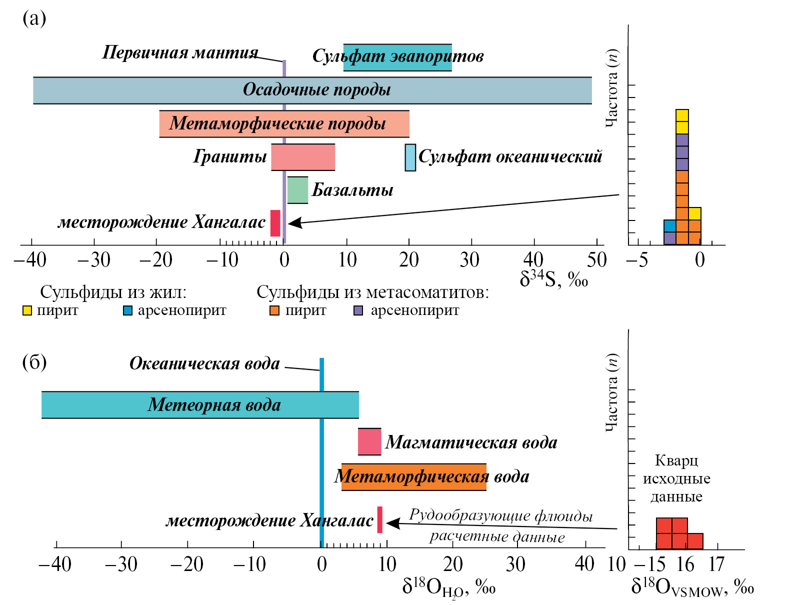 Месторождение Хангалас находится в 150 км к юго-востоку от поселка Усть-Нера и в 800 км к северо-востоку от г. Якутска (см. фиг. 1). Оно было открыто в 1947 г., геолого-разведочные работы с проходкой поверхностных и подземных горных выработок проводились в 1948–1952 гг. и 1962–1963 гг. Верхне-Индигирской экспедицией. Добыча Au на месторождении из богатых кварцевых жил производилась комбинатом “Индигирзолото” подземным способом в 1968–1973 гг., всего было добыто около 1.3 т золота cо средним содержанием 35.8 г/т. В начале 2000-х гг. Верхне-Индигирской экспедицией возобновлены поисковые и разведочные работы на флангах и глубоких горизонтах месторождения, утверждены запасы Au категорий С1+С2 в количестве 4.8 т. Следующий этап геологоразведочных работ в 2014–2016 гг. проводился ООО “Янтарь”. С 2018 г. права на разведку и опытно-промышленную разработку месторождения принадлежат АО “ВЕДК”. Общество осуществляет геолого-разведочные работы, добычу руды подземным и открытым способами. Построена обогатительная фабрика, извлечение Au осуществляется гравитационным способом. По состоянию на 01.10.2022 балансововые запасы категорий С1+С2 составляют 9.6 т Au cо средним содержанием 5.2 г/т (https://www.vedk.com/assets/resources).