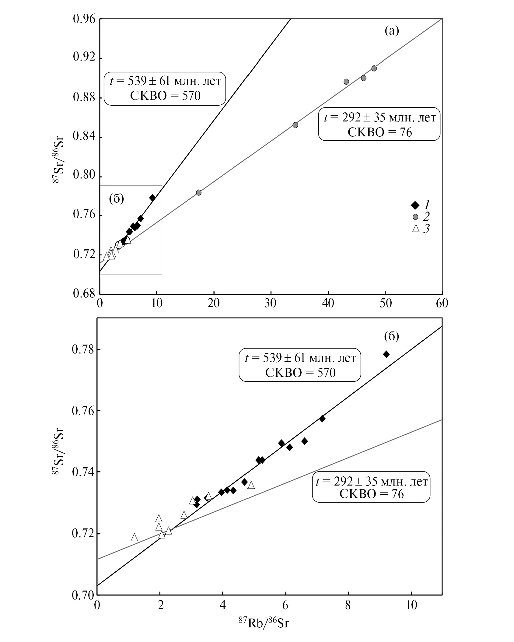 Результаты Rb–Sr изотопного исследования пород и минералов Верхнекаралонского месторождения приведены в табл. 2 и на фиг. 2 и 3. Точки изотопных составов неизмененных и слабо измененных гранитов, а также гидротермально измененных пород (Qtz–Ser–Ab) Верхнекаралонского рудовмещающего массива на диаграмме в координатах 87Rb/86Sr – 87Sr/86Sr образуют линейную регрессию, угол наклона которой отвечает значению возраста 539 ±61 млн лет (см. фиг. 2). Эта величина в пределах большой погрешности согласуется с U-Pb оценкой возраста 598±4 млн лет гранитоидов изученного массива (Рыцк и др., 20181).