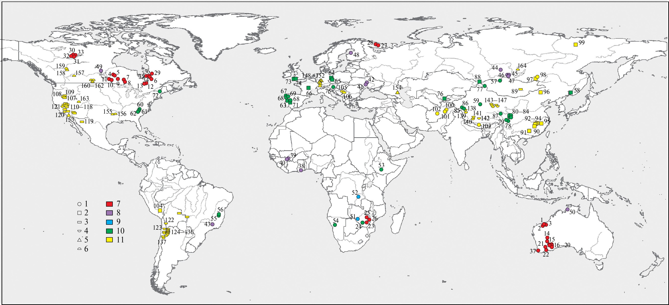 Фиг. 1. Месторождения лития, вошедшие в анализируемую выборку. Условные обозначения: 1–5 –типы месторождений: 1 – пегматитовый, 2 – гранитный, 3 – глинистый, 4 – саларный, 5 – геотермальный, 6 – нефтегазовых полей; 7–11– суперконтинентальные циклы: 7 – кенорский, 8 – колумбийский, 9 – родинийский, 10 – пангейский, 11 – амазийский. Месторождения: 1 Пилгангура, 2 Воджина, 3 Арчер, 4 Пэйкагама, 5 Спарк, 6 Моблан, 7 Сеймур-Лэйк, 8 Нама-Крик, 9 Рут-Бэй, 10 Сепарейшн-Рэпидз, 11 Танко, 12 Лакорн, 13 Отье, 14 Кэтлин-Вэлли, 15 Маунт-Айда, 16 Анна, 17 Болд-Хилл, 18 Манна, 19 Маунт-Мэрион, 20 Пионердоум-Норт, 21 Эрл-Грей, 22 Маунт-Кэттлин, 23 Бикита, 24 Зулу, 25 Аркадия, 26 Саби-Стар, 27 Колмозерское, 28 Полмостундровское, 29 Корветт CV5, 30 Хиден-Лэйк, 31 Рид-Лэйк – Хардинг-Лэйк, 32 Бигхилл-Лэйк, 33 Тор, 34 Вабуши, 35 Джеймс-Бэй, 36 Роуз, 37 Гринбушес, 38 Эвояa, 39 Бугуни, 40 Гуламина, 41 Надия–Станковатское, 42 Полоховское, 43 Вольта-Гранде, 44 Вишняковское, 45 Белореченское, 46 Гольцовое, 47 Урикское, 48 Рапасаарет-Оутовеси, 49 Векуско-Лэйк, 50 Финнисс, 51 Камативи, 52 Маноно-Китотоло, 53 Кентича, 54 Юис, 55 Итинга, 56 Колина, 57 Тастыгское, 58 Вознесенское, 59 Тогайлэкэ, 60 Черривиль, 61 Холлман-Бим, 62 Кингз-Маунтин, 63 Архемела, 64 Задисдорф, 65 Циновец – Циннвальд, 66 Эшассьер, 67 Альберта, 68 Барросу, 69 Сепеда, 70 Лас-Навас, 71 Вальдефлорес, 72 Пламбаго-Норт, 73 Трелавур, 74 Ганхис, 75 Вайнебене, 76 Шавазсай, 77 Коктогай, 78 Цзяцзика, 79 Мужун, 80 Лицзягоу, 81 Елунгоу, 82 Сэцзэмуцзу, 83 Даньба, 84 Цзяда, 85 Байлуншань, 86 Сюэфэнлин, 87 Чжаулун, 88 Алахинское, 89 Хухдел, 90 Ичунь, 91 Чжэнчун, 92 Дантянь, 93 Сикэн, 94 Даган, 95 Суншуган, 96 Вэйласыто, 97 Орловское, 98 Завитинское, 99 Кестер, 100 Парун, 101 Шамакат, 102 Тагавлор, 103 Цюнцзяган, 104 Фальчани, 105 Ядар, 106 Валево, 107 Такер-Пасс, 108 Кингс-Вэлли, 109 Макдермитт-Норт, 110 Тонопа, 111 Риолит-Ридж, 112 Зевс, 113 Клэйтон-Вэлли, 114 Макджи, 115 Бонни-Клэр, 116 Форт-Кэйди, 117 Биг-Сэнди, 118 Бэйсин, 119 Сонора, 120 Силвер-Пик, 121 Серлз-Лейк, 122 Салар-де-Уюни, 123 Салар-де-Атакама, 124 Салар-де-Оларос, 125 Салар-де-Каучари, 126 Салар-дель-Ринкон, 127 Пастос-Грандес, 128 Салар-де-Посуэлос, 129 Салар-де-Льюльяильяко, 130 Сентенарио-Ратонес, 131 Салар-де-Рио-Гранде, 132 Саль-де-Лос-Анхелес, 133, Салар-дель-Омбре-Муэрто, 134 Канделас, 135 Качи, 136 Салар-де-Марикунга, 137, Трес-Кебрадас, 138 Кушуй, 139 Лунмуцо, 140 Цзабуе, 141 Лагоцо, 142 Дансюнцо, 143 Илипин, 144 Си-Тайцзинайэр, 145 Дун-Тайцзинайэр, 146 Чэрхань, 147 Дачайдань, 148 Ортенау, 149 Инсхайм–Ландау, 150 Таро–Кернер, 151 Флаггентурм, 152 Мангейм–Терезе, 153 Солтон-Си, 154 Тарумовское, 155 Смэкоувер-Ланзесс, 156 Смэкоувер-Тетра, 157 Бэшо, 158 Бордвок, 159 Пис-Ривер, 160 Прэари, 161 Мансур, 162 Вьюфилд, 163 Парадокс, 164 Ковыктинское.
