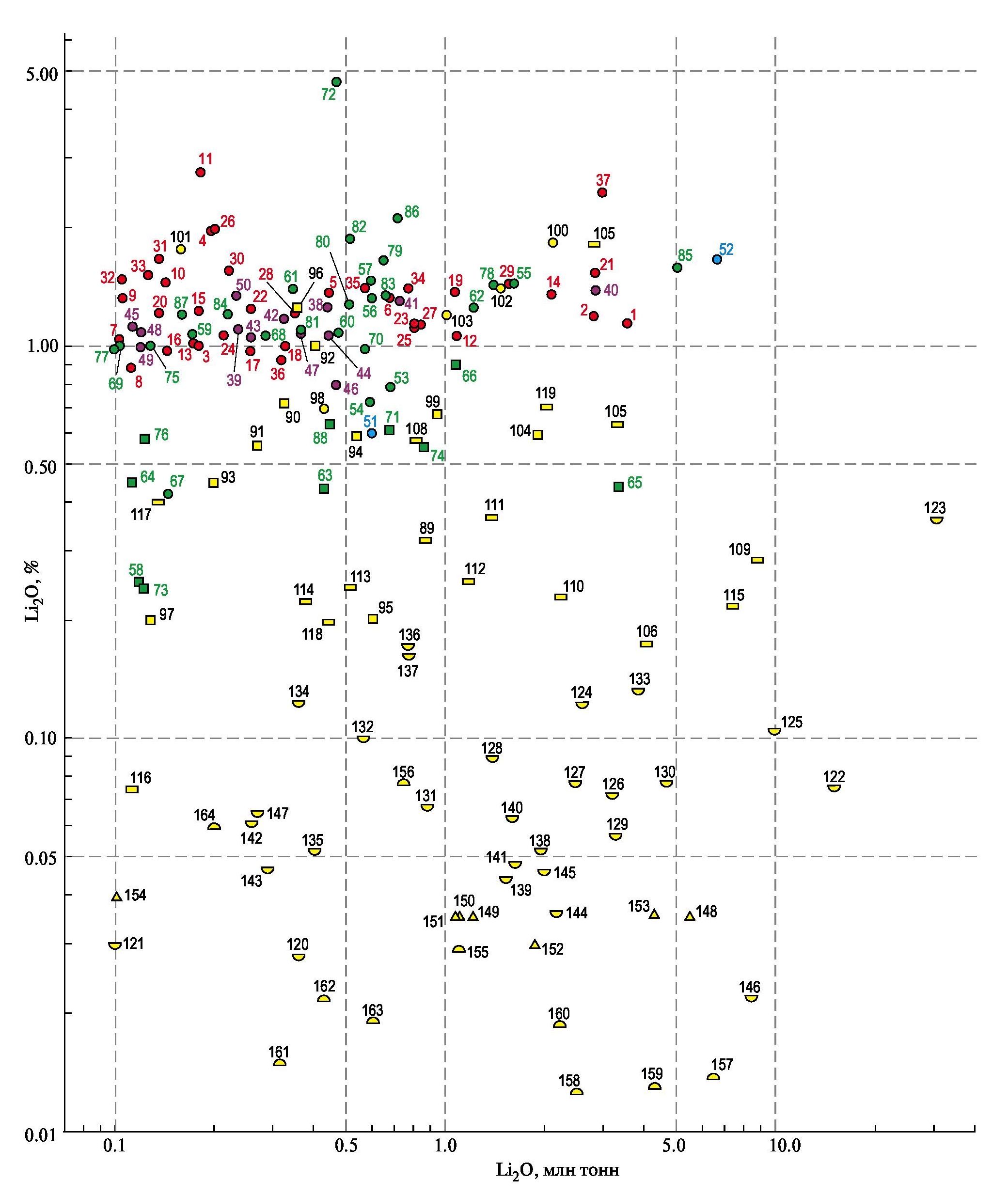 Фактологической основой для проведения исследований послужили сведения из базы данных “Крупные и суперкрупные месторождения мира”, созданной и постоянно корректируемой в ГГМ РАН (Рундквист и др., 2006). В выборку для анализа были включены месторождения шести металлогенических типов (табл. 1), представители которых или эксплуатируются уже многие годы (пегматитовый, гранитный, саларный), или находятся в стадии опытной эксплуатации и строительства первых добычных и перерабатывающих предприятий (глинистый, геотермальный, нефтегазовых полей), т.е. начали представлять интерес для промышленности недавно. Во всех месторождениях выборки литий является или главным, или принципиально важным попутным компонентом, а его ресурсная оценка, основанная на данных, полученных в результате геологоразведочных работ с опробованием канав, подземных горных выработок, буровых скважин, составляет не менее 100 тыс. тонн в пересчете на Li2O. Для месторождений, оцененных с использованием советской и российской классификаций запасов и ресурсов, в эту сумму включались запасы всех категорий и ресурсы категории Р 1 . Для месторождений, оцененных по классификациям JORC или NI 43–101, принималась сумма ресурсов категорий measured+indicated+inferred, а также запасы категорий proved+probable, если они не были учтены в ресурсах measured+indicate. В информационных источниках по месторождениям лития в Китае очень редко указывается категоризация запасов и/или ресурсов, хотя оригинальная классификация в этой стране существует. Авторами условно принималось, что публикуемые оценки запасов/ресурсов в использованных источниках информации о месторождениях Китая отвечают требованиям перечисленных выше классификаций других стран. Кроме того, в сумму всегда включались данные о прошлой добыче на объекте, при ее наличии. Далее в тексте для краткости изложения все величины разведанных запасов и ресурсов как отдельных месторождений, так и их групп, названы ресурсами.