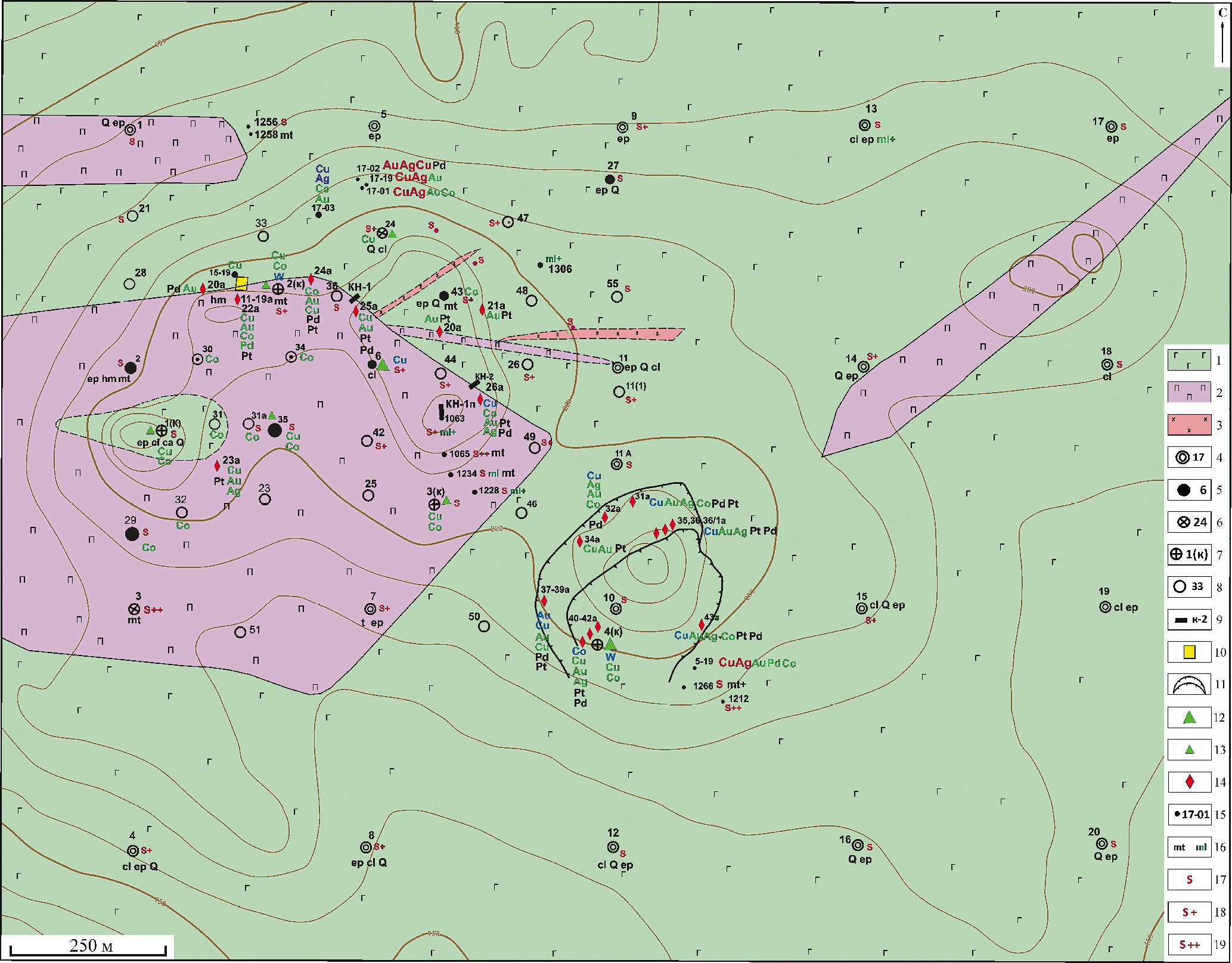 Фиг. 3. Василиновское рудопроявление: элементы геологического строения, схема его опробования и минералого-геохимических признаков; по данным В.Д. Мокрия (2006, 2017–2022 гг.), Е.Э. Тюковой, Ю.Н. Ивановой, И.В. Викентьева, И.Д. Соболева (2019, 2021 гг.). 1‒2 – кэршорский комплекс дунит-клинопироксенит-габбровый: 1 – габбро роговообманковое, габбро-амфиболиты, амфиболиты, 2 – клинопироксениты; 3 – собский комплекс габбро-тоналитовый: гипабиссальные дайки кварцевых диоритов; 4‒8 – буровые скважины: 4 – предварительной разведки 1980–84 гг. (до 105 м), 5–8 – скважины детальной разведки 1986–90 гг. и их номера (до 28 м), в том числе: 6 – разведочные (до 38 м), 7 – разведочно-технологические – кусты (до 45 м), 8 – картировочно-вскрышные (до 27.5 м); 9 – канавы детальной разведки 1986–90 гг. и их номера; 10 – опытный карьер детальной разведки (150 м 2 ); 11 – карьер строительного камня Амфиболитовый; 12,13 – содержание меди в керновых пробах 1986–90 гг.: 12 – рудогенного уровня (0.2% Cu), 13 – среднеаномального уровня (0.04–0.1%); 14 – штуфные пробы 2006 г. с аномальным содержанием Au, Cu, Co, Ag, Pd и повышенным – Pt; 15 – штуфные пробы 2017–22 гг.; 16 – повышенные количества магнетита (mt), малахита (ml); 17–19 – уровни содержания сульфидов в породе: 17 – убогий, 18 – в повышенном количестве, 19 – в аномальном количестве. Прочая минерализация и гидротермальные изменения: Q – окварцевание (прожилковое), ep – эпидотизация (прожилковая), hm – гематитизация, ca – прожилки кальцита, cl – хлоритизация, t – оталькование. Цветными символами элементов Au, Cu, Co, Ag, Pd даны уровни концентраций металлов в пробах: красным шрифтом – рудный уровень, синим – высокоаномальный (рудогенный) уровень, зеленым – среднеаномальный уровень: медь (>0.3, >0.1, >0.04 мас.%); кобальт (>0.06, >0.02, >0.01 мас.%); золото (>1, >0.3, >0.01 г/т); серебро (>3.5, >0.7, >0.15 г/т); палладий (>0.1 г/т); черным шрифтом даны повышенные содержания палладия и платины (0.03-0.1 г/т).