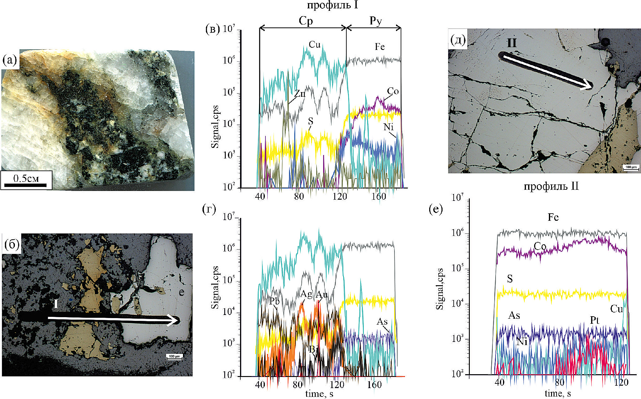 Фиг. 24. Распределение содержаний элементов-примесей в пирите и халькопирите из кварцевых жил (а, б) Среднего карьера участка Подгорненский (обр. А2-8-19). Au, Ag, Pb, Zn локализованы в халькопирите и, вероятно, представляют собой минеральные микровключения (Ag = 2.3 ppm, Au = 0.23 ppm); Co, As, Ni – приурочены к пириту, и их концентрации распределены относительно равномерно. Обнаружены следы висмута по контакту пирита и халькопирита (в, г), а также примесь Pt = 0.29–1.08 ppm и Pd = 0.24 ppm в пирите профиля II (д, е).