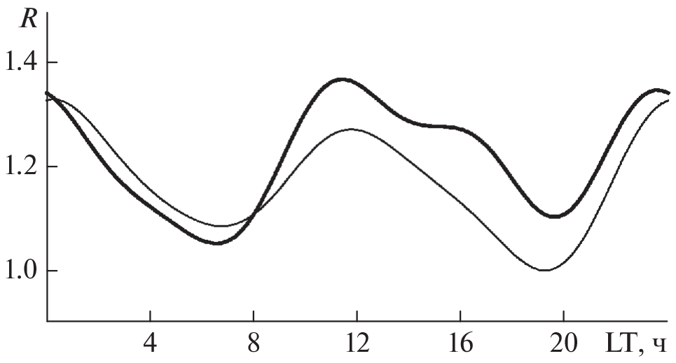 На основе данных медиан электронной концентрации максимума F2-слоя NmF2 пары ионосферных станций Боулдер–Хобарт за 1963–2013 гг. проведен анализ зависимости локального индекса годовой асимметрии R от местного времени и солнечной активности, где индекс R – отношение январь/июль суммарной концентрации NmF2 (для этой пары станций) в фиксированное местное время. В качестве индикатора солнечной активности для медианы NmF2 использован индекс F – среднее за 81 день значение потока радиоизлучения Солнца на длине волны 10.7 см, которое центрировано на середину данного месяца. Получено, что в зависимости индекса R от местного времени LT преобладает полусуточная мода с максимумами вблизи полудня и полуночи и минимумами утром и вечером. Самые низкие значения R = 1 наблюдаются при низкой солнечной активности в узком интервале 19.0–19.5 LT. Годовая асимметрия в медиане NmF2 существует (R > 1) для всех остальных часов местного времени при любом уровне солнечной активности. Вблизи полудня индекс R увеличивается с солнечной активностью с тенденцией к насыщению при высоком уровне этой активности. Вблизи полуночи в зависимости индекса R от F наблюдается максимум для F = 140, при превышении которого R уменьшается с ростом F. Высокие значения индекса R в полдень и полночь, в основном, обусловлены относительно высокими значениями NmF2 в январе в Cеверном полушарии (местной зимой, Боулдер) в полдень и в Южном полушарии (местным летом, Хобарт) в полночь.