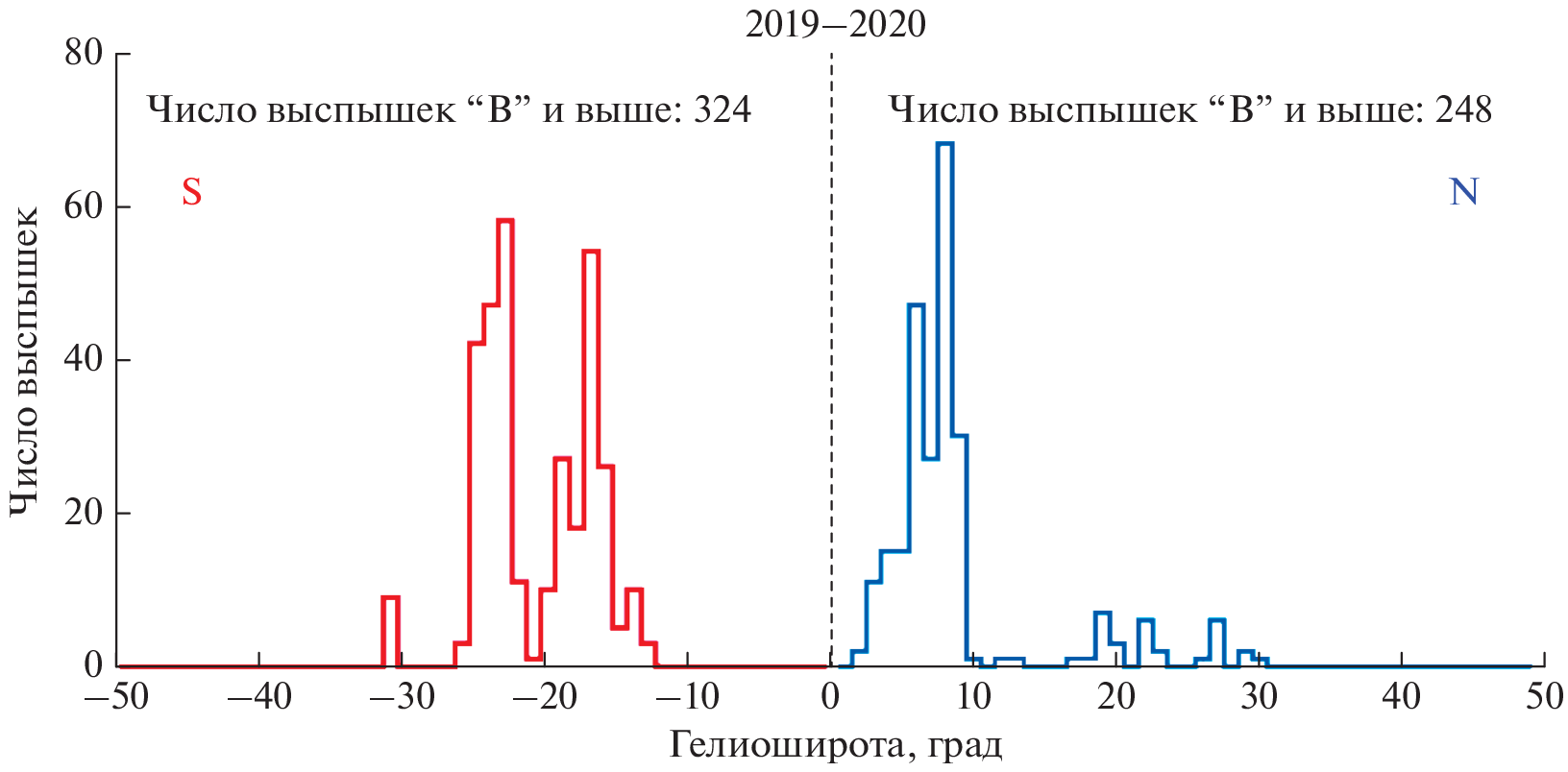 Мы используем данные телескопа Atmospheric Imaging Assembly (AIA) на космическом аппарате Solar Dynamics Observatory (SDO) в канале 171 Å, чтобы исследовать пространственное распределение вспышек малой энергии (нановспышек). Мы исследовали два периода: 20.05.2019 с 12:00 UT до 13:00 UT и 10.05.2020 с 12:00 UT до 13:00 UT. Всего нами было найдено 87 974 нановспышки со средним темпом формирования 6.0 × 10–21 см–2 с–1. Для солнечных широт от 0° до 50° темп формирования нановспышек является примерно равномерным со среднеквадратичным отклонением около 25%. Нами обнаружена асимметрия в темпе формирования нановспышек в южном и северном полушариях Солнца: темп формирования нановспышек в южном полушарии был на 34–42% больше, чем в северном. В этот период такая же асимметрия наблюдалась и для обычных вспышек. Мы также обнаружили слабую зависимость темпа формирования нановспышек от солнечного цикла: число нановспышек растет при более высокой активности Солнца.