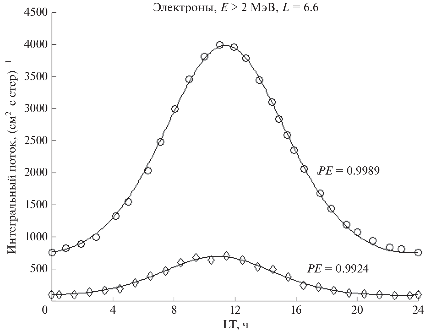 Предложена новая математическая модель с использованием обыкновенного дифференциального уравнения, описывающая аналитически (когда индекс геомагнитной активности Kp = const или Kp ≈ const) или численно (если Kp(t) ≠ const) перпендикулярные (для питч-угла 90°) дифференциальные или интегральные потоки релятивистских электронов на геостационарной (геосинхронной) орбите, а также на любой круговой орбите в магнитосфере Земли. В модели предполагается, что потоки зависят от местного времени LT на орбите, Kp, параметра Мак-Илвейна L и перпендикулярного дифференциального потока или интегрального потока релятивистских электронов, взятых для 00 LT. Используются наблюдения потоков релятивистских (>2 МэВ) электронов, усредненные по местному часу LT вдоль орбиты космического аппарата GOES с 1995 по 2009 г. Выполнено сравнение модели с этими данными. Получено практически идеальное согласие наблюдений с моделью при эффективности предсказания точности модели PE = 0.9989. Использование аналогичных данных аппарата GOES 10 позволяет получить PE = 0.9924. Предложенные формулы позволяют находить, например, среднюю величину перпендикулярного интегрального потока релятивистских электронов за сутки и прогнозировать приблизительно на сутки вперед максимальный перпендикулярный интегральный поток релятивистских электронов на геостационарной орбите. Нелинейный эффект теоретически прогнозируется в виде нелинейной зависимости отношения максимального перпендикулярного интегрального потока к минимальному потоку заряженных частиц на геостационарной орбите от Kp-индекса геомагнитной активности. Пока сравнение модели с усредненными интегральными потоками релятивистских электронов произведено для диапазона 0 ≤ Kp < 6 с прогнозируемым максимальным отношением потоков в 24.4139 раза при Kp = 8 и с PE = 0.8678.