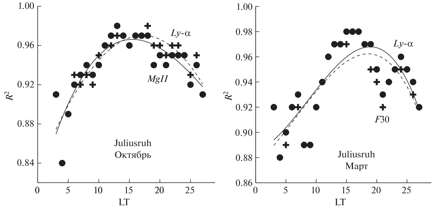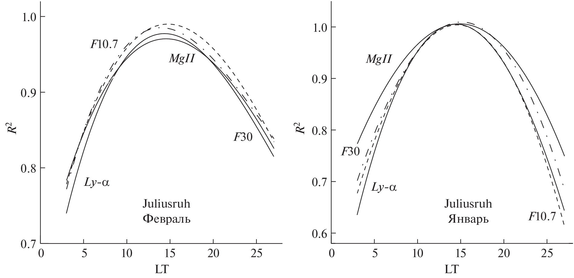for description of the foF2 dependence on SA at all LT hours are MgII, F30, and Ly-α.
