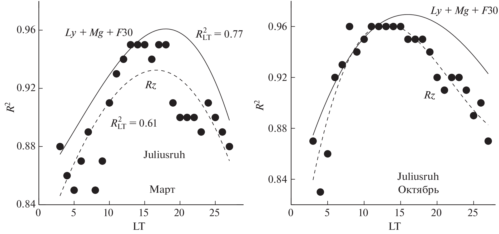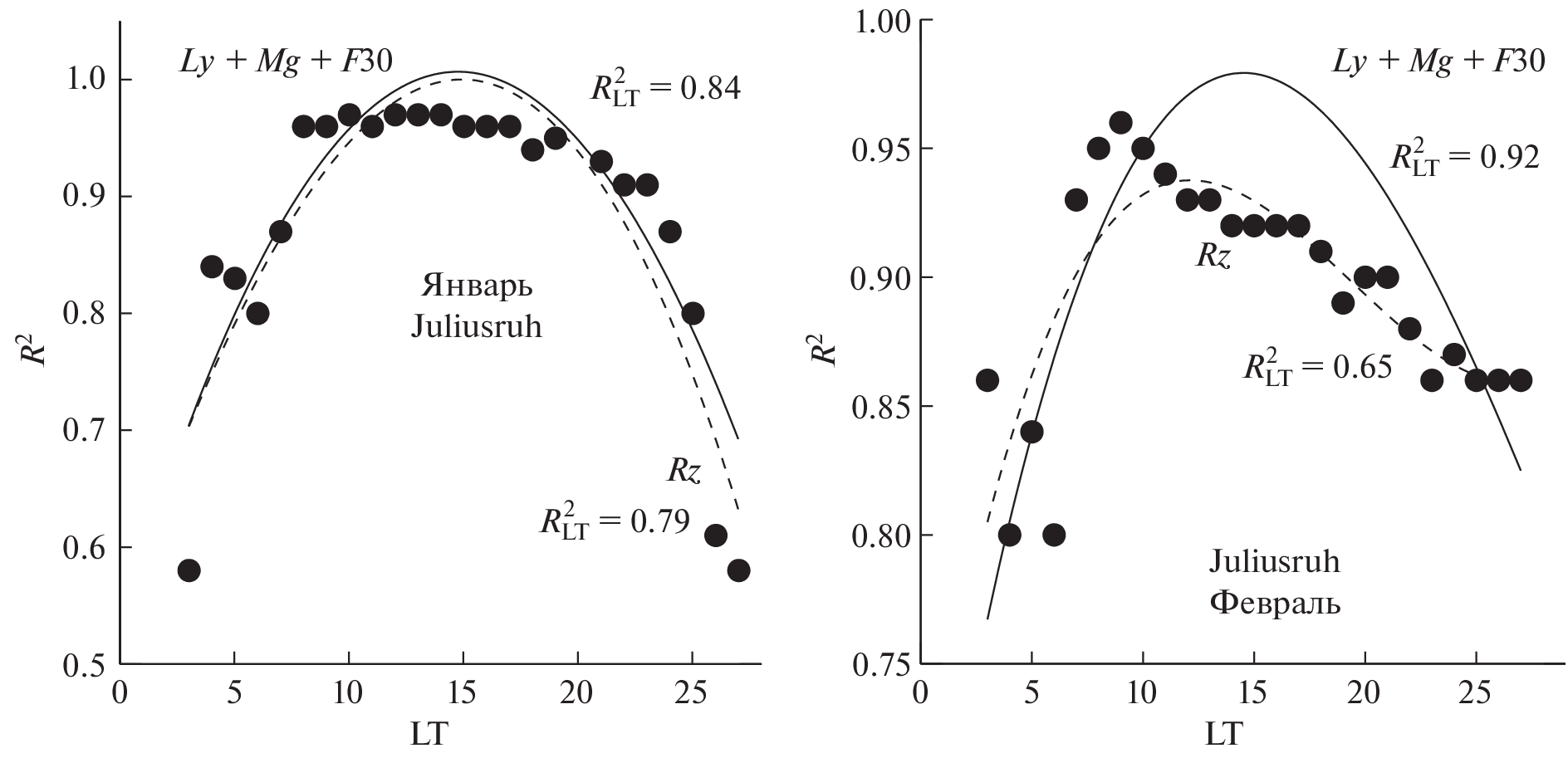 describe the foF2 behavior better in the daytime than at night. A well-pronounced diurnal variation in R2 is