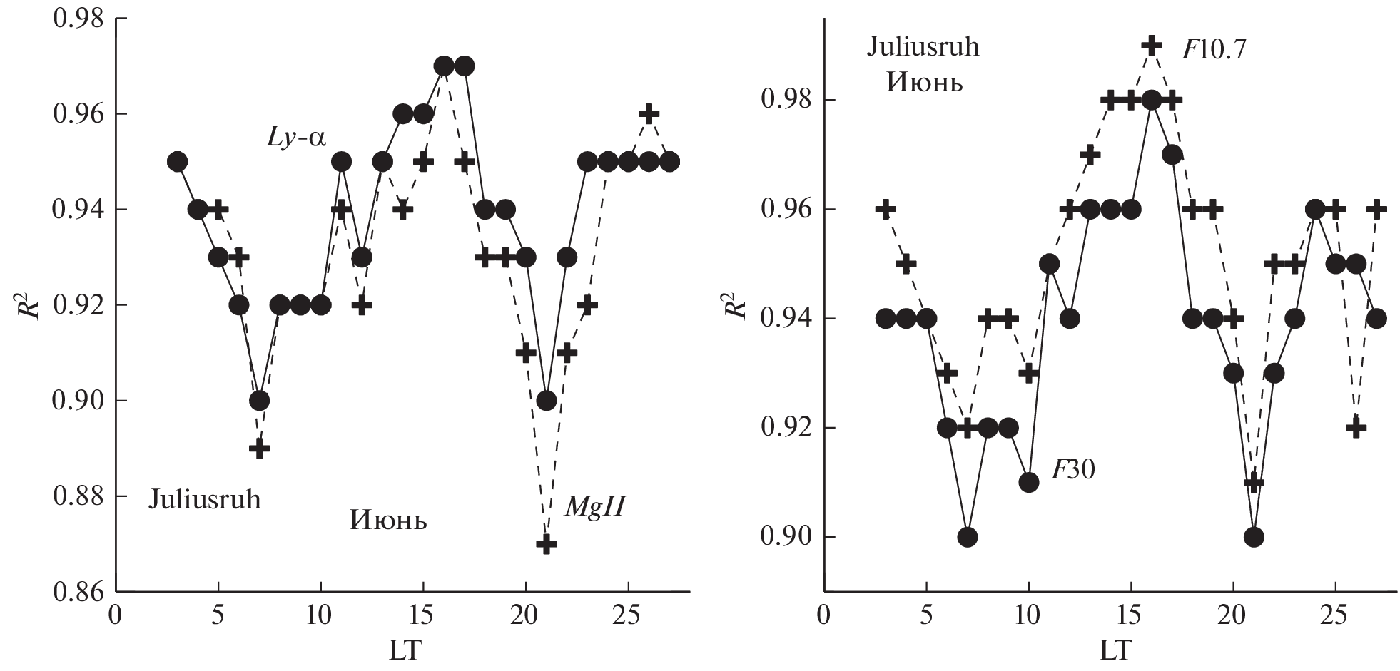 month (June) are considered. Five solar proxies: Ly-α, MgII, Rz, F30, and F10.7 have been analyzed.