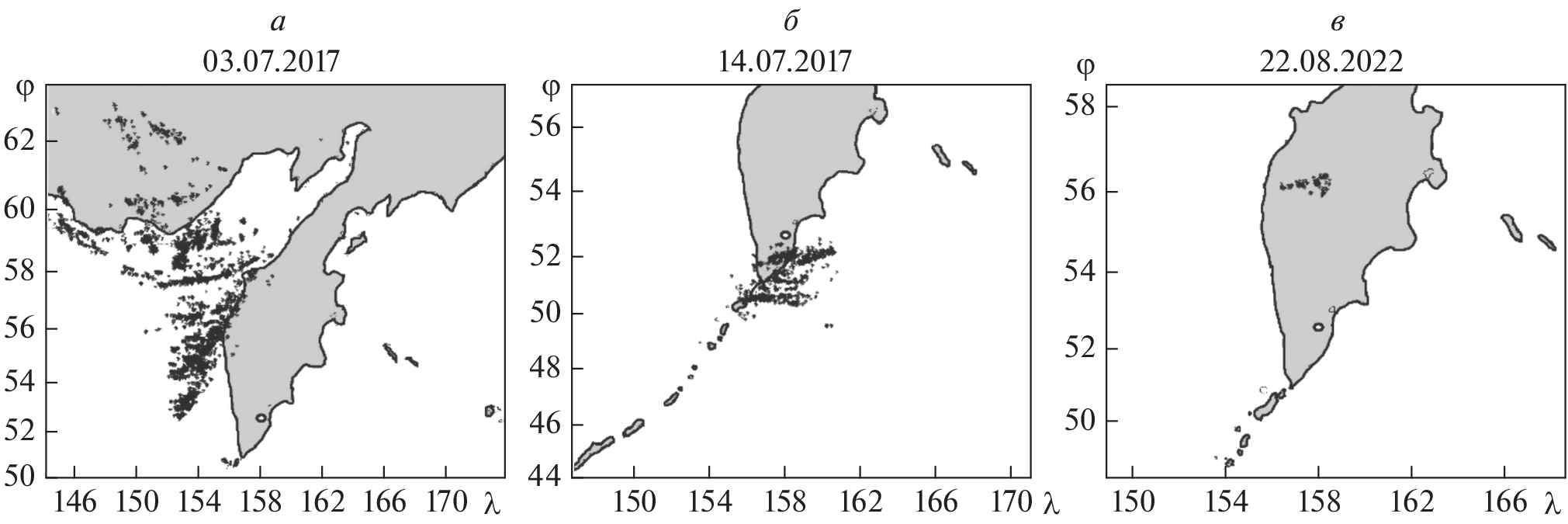lightning discharges on the western and southern coasts of the Kamchatka Peninsula, which can be associated