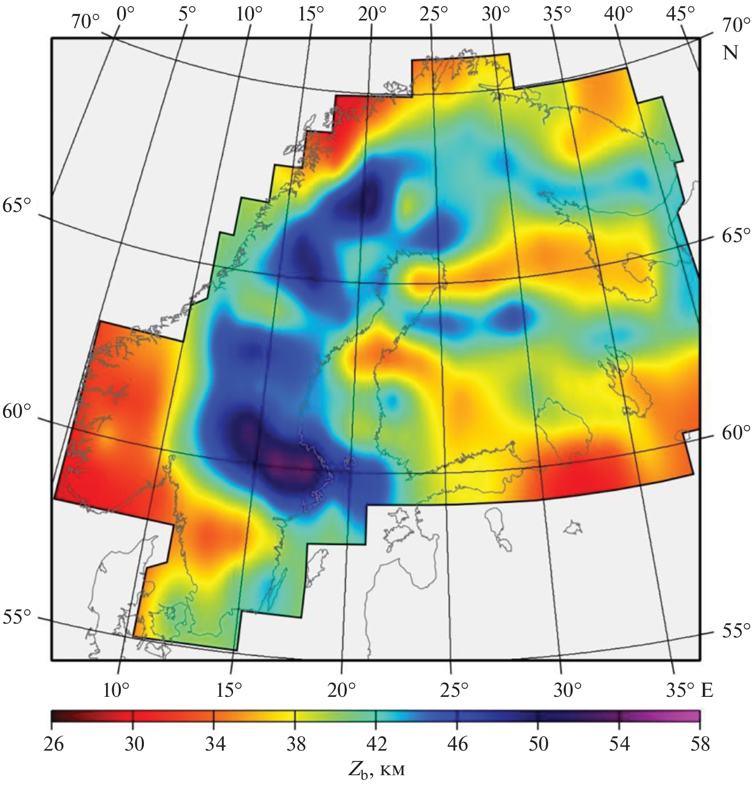 the Scandinavian Caledonides, the maximum (>45 km), under the Scandinavian Peninsula, in the west of