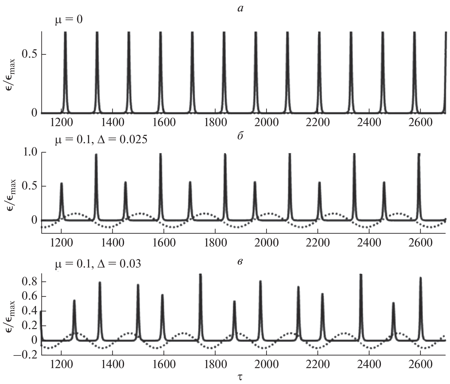 Pассматриваются новые сведения о КНЧ/ОНЧ-излучениях за пределами плазмосферы, содержащиеся в данных наблюдений, выполненных на космических аппаратах Van Allen Probes. Вблизи апогея траектории за плазмосферой отмечались квазипериодические последовательности всплесков электромагнитных излучений на частотах ниже 2 кГц с глубокой модуляцией интенсивности. Морфологически отдельный всплеск излучений подобен фрагменту излучений QP 2. Рассматриваемые последовательности всплесков могут иметь разную временнýю структуру. Во-первых, они могут быть четко периодическими. Во-вторых, в них могут периодически чередоваться всплески разной интенсивности. В-третьих, последовательность всплесков может иметь более сложную временнýю структуру. Возбуждение рассматриваемых шумовых по своей природе излучений, вероятно, происходит при развитии циклотронной неустойчивости в облаках оторвавшейся плазмы, которые существуют за пределами плазмосферы после магнитных возмущений. Многие свойства излучений объясняет теория плазменного магнитосферного мазера, допускающая существования автоколебательного процесса генерации излучений, обусловленного модуляцией анизотропии функции распределения энергичных электронов. Теория объясняет новые результаты наблюдений квазипериодических излучений с более сложной временнóй структурой при наличии периодического внешнего воздействия на динамику плазменного магнитосферного мазера. Во всех рассмотренных случаях было проверено в данных магнитометра космического аппарата отсутствие признаков геомагнитных пульсаций с периодами, сравнимыми с периодами повторения спектральных форм на спектрограммах электромагнитных излучений. Модельные расчеты показали, что акустико-гравитационная волна в ионосфере в основании трубки магнитного поля с облаком оторвавшейся плазмы может обеспечить формирование наблюдаемой временнóй структуры излучений.
